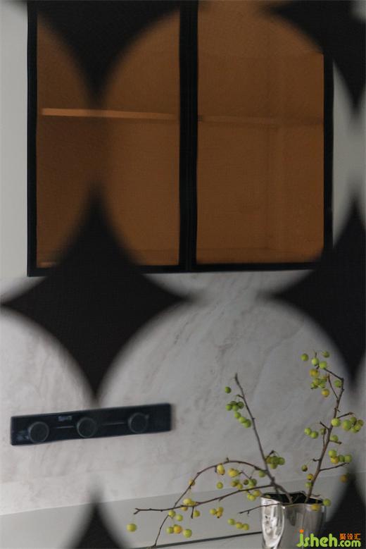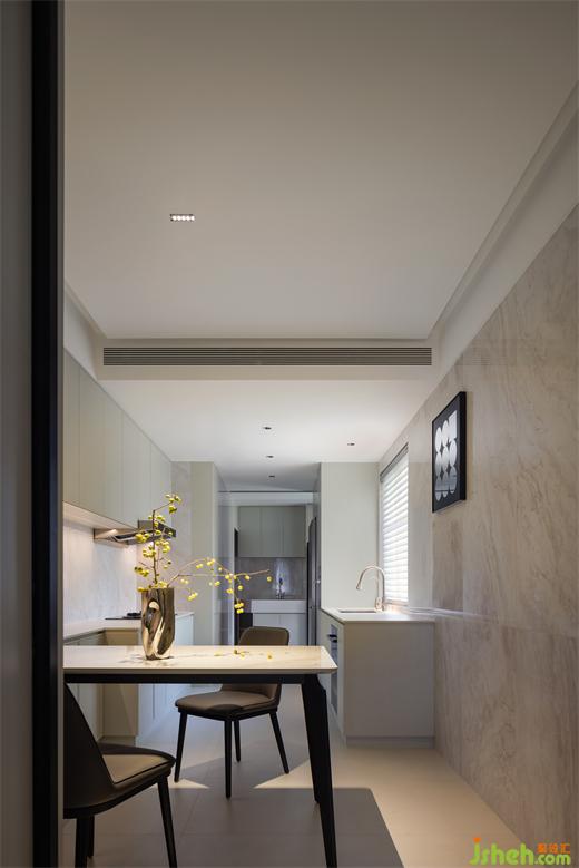 原始結(jié)構(gòu)中,餐廳沒(méi)有采光,于是我們將餐廳和廚房連通,復(fù)式裝修設(shè)計(jì)讓廚房的采光得以引入餐廳。