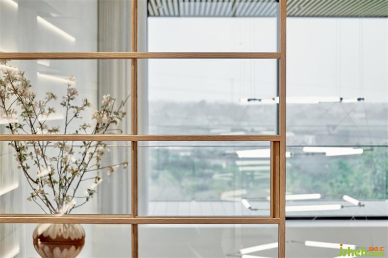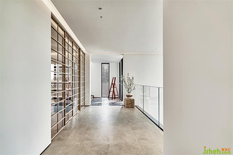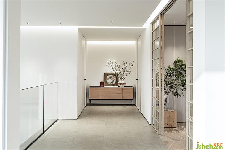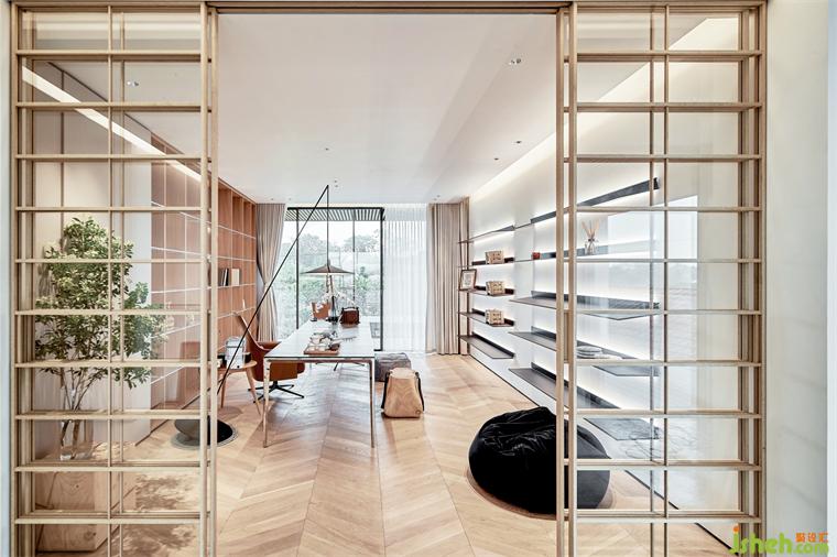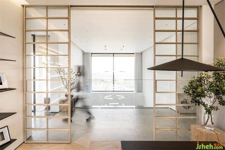 步入二層長廊,舒適溫潤的氣質(zhì)延續(xù)演繹。連接書房和樓道的木格柵,以鏤空設(shè)計(jì)控制光線的明暗,輕盈清透的玻璃,引借自然光映亮居室。
