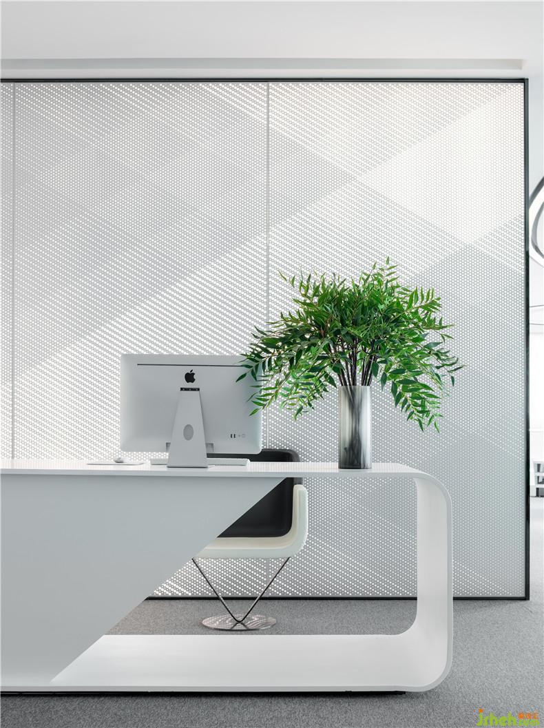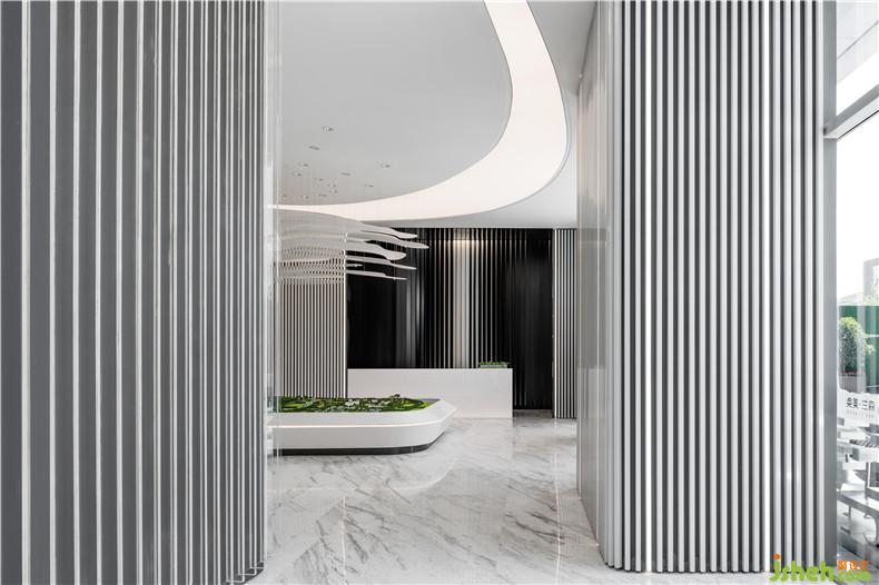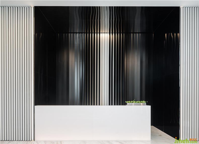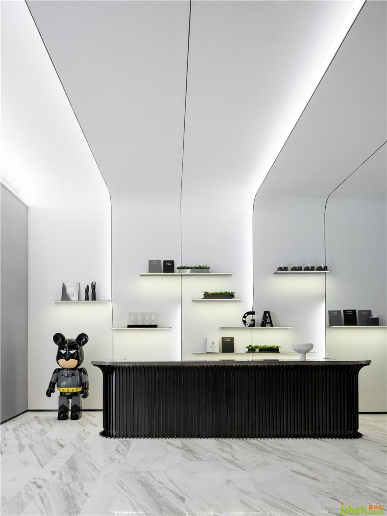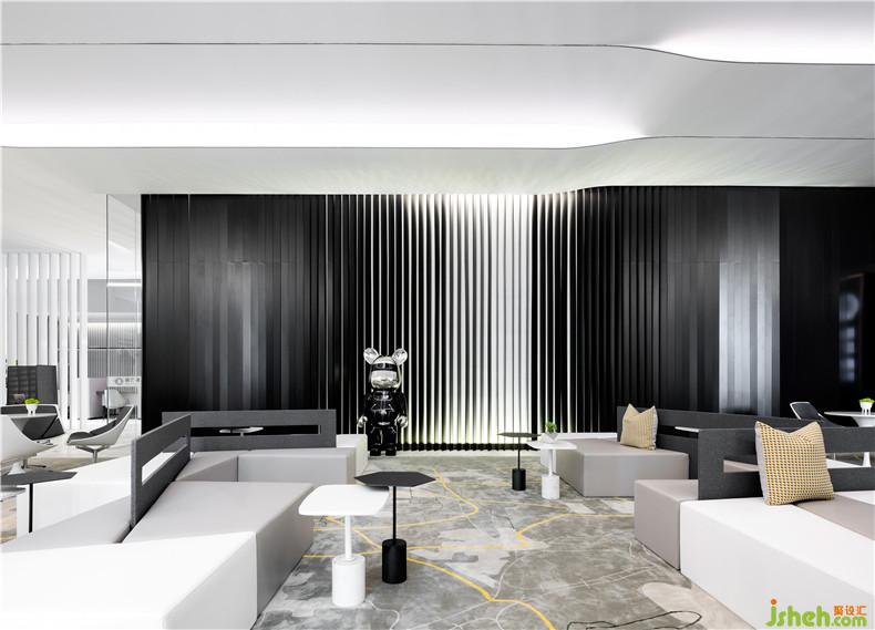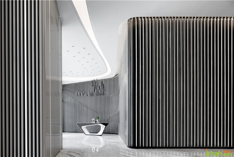 設(shè)計(jì)師黃全以科技元素串聯(lián)設(shè)計(jì)思路,在上海自貿(mào)區(qū)打造充滿想象和未來感的空間。漸變過渡的繪畫手法調(diào)和黑白鋁條單一的色彩,色彩的纏綿將空間質(zhì)感研磨到極致。從裝飾墻面前走過,仿佛能看見一束自然光線在隔柵上輕輕流淌,溫柔而靈動。