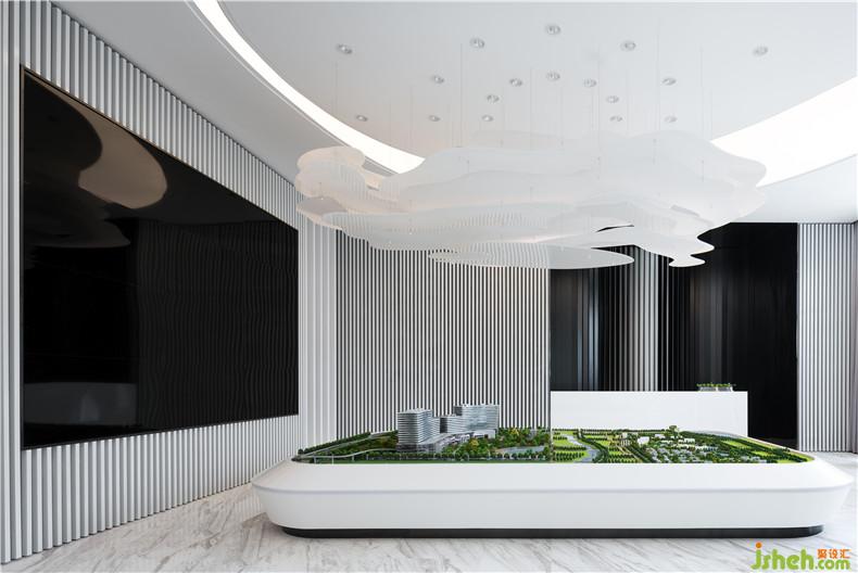 洽談區(qū)天花板層層疊套的設(shè)計(jì)中嵌入隱蔽式燈光,仿似乍破的天光傾瀉而下,浮動的光芒使內(nèi)部建筑的具體高度成為變數(shù),這種虛化空間高度的處理方式也引發(fā)了訪者對流動體感的想象。
