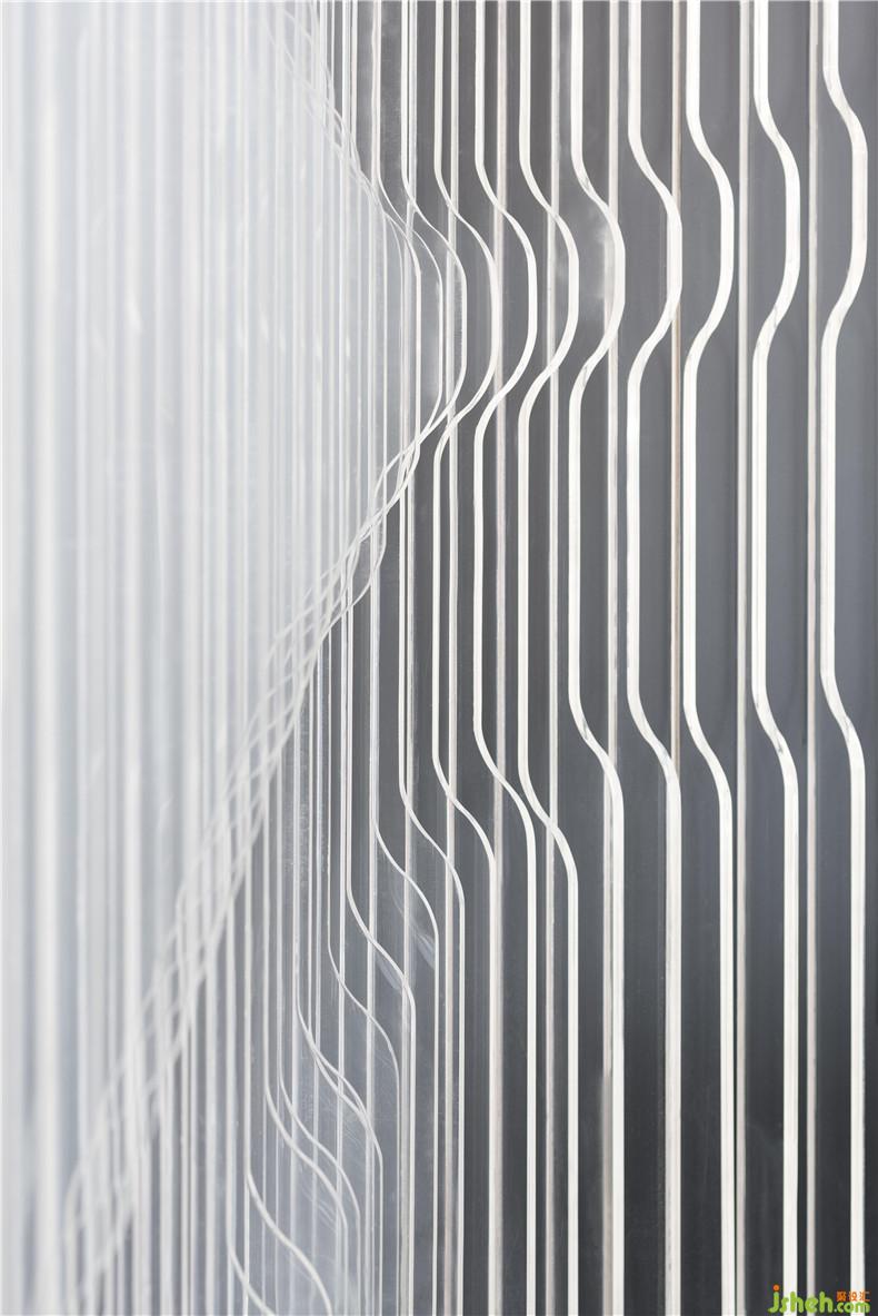 晶瑩剔透的亞克力材質(zhì)的墻體上流暢的撥痕,似有一塊無形的撥片游走其上,余留的旋律絮絮無盡過往。沿弧線蔓延的四束光帶,如同旋律中的滑音符,奏出冷靜流暢的空間氣質(zhì)。