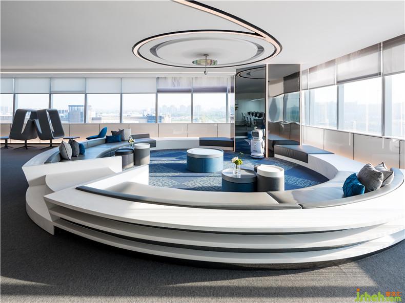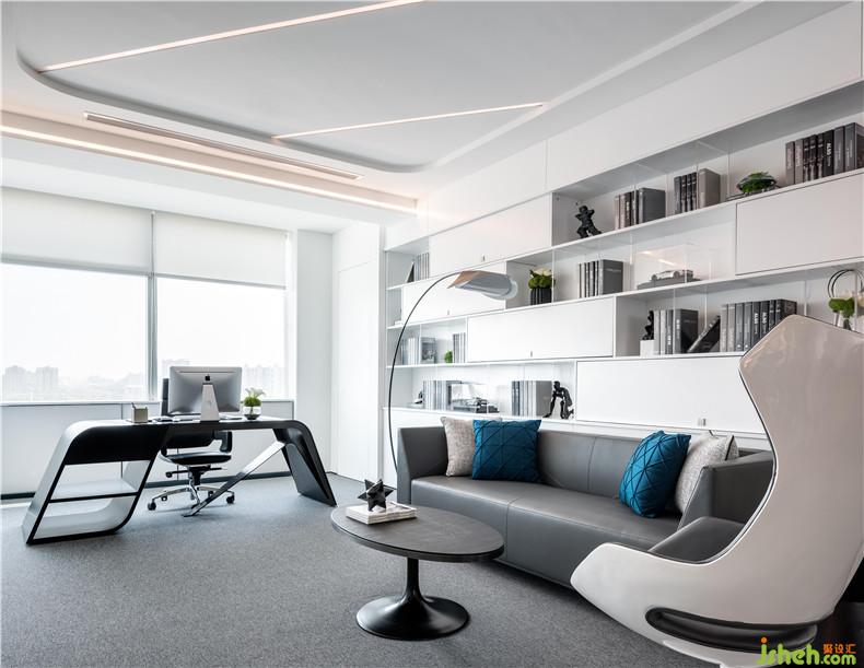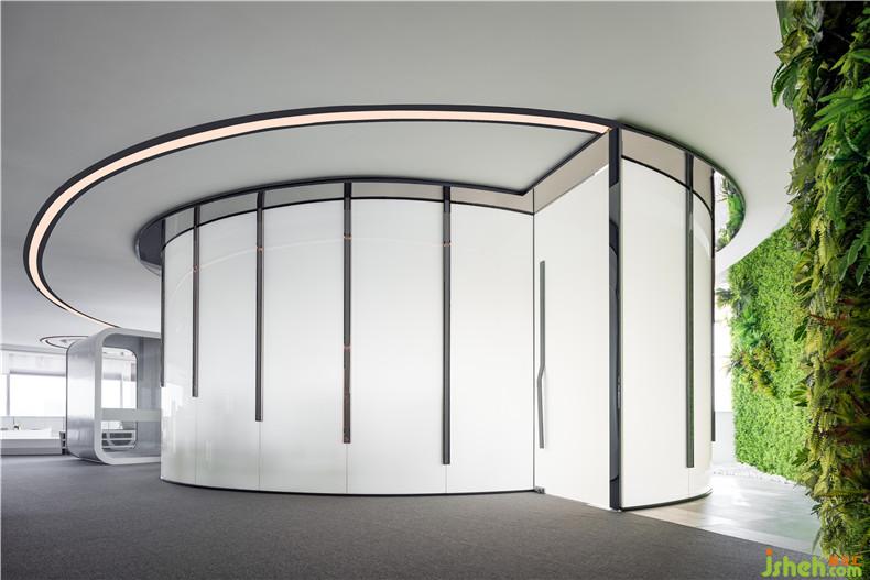 互動(dòng)式辦公區(qū)利用天花板材質(zhì)的區(qū)別劃分具體界限,空間在錯(cuò)落擺放的綠植的掩映下,散發(fā)著自然、透氣的輕松氛圍。經(jīng)理室最吸睛的設(shè)計(jì)莫過(guò)于墻體天花板的曲線光帶,如同將神秘原力輸送至冰冷的材質(zhì)肌理之下,漫反射作用使流溢的光線跳躍在視線所及的每一處,為空間注入生機(jī)和活力。