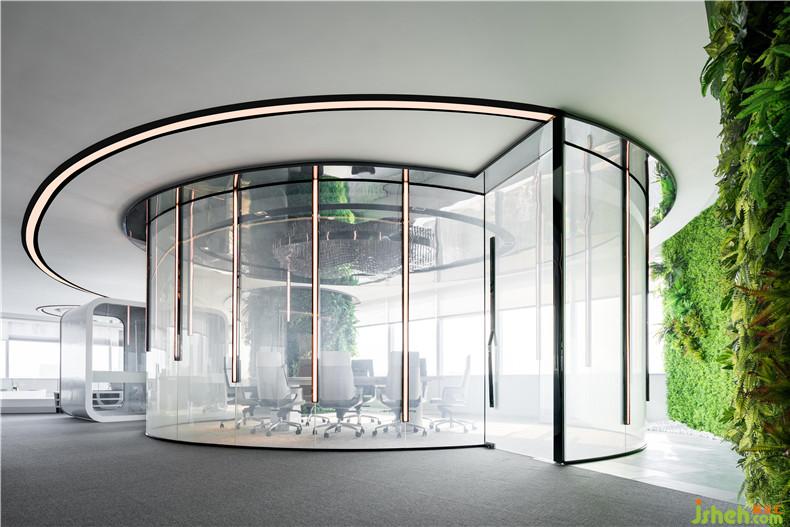 擁有“艙體”概念的會(huì)議室,選用通電霧化玻璃作為半包式的“墻壁”,另一側(cè)則以植墻體環(huán)繞,實(shí)現(xiàn)真正的花園式辦公。智能霧化玻璃通電變色,隔絕出相對(duì)隱蔽的私密空間,其余時(shí)間則恢復(fù)透明,維持整體空間的流暢性。
