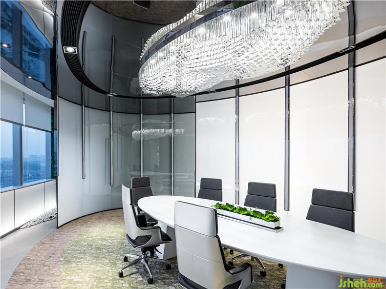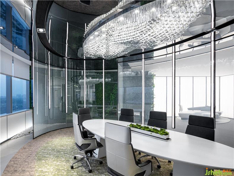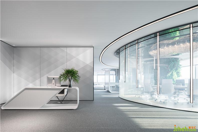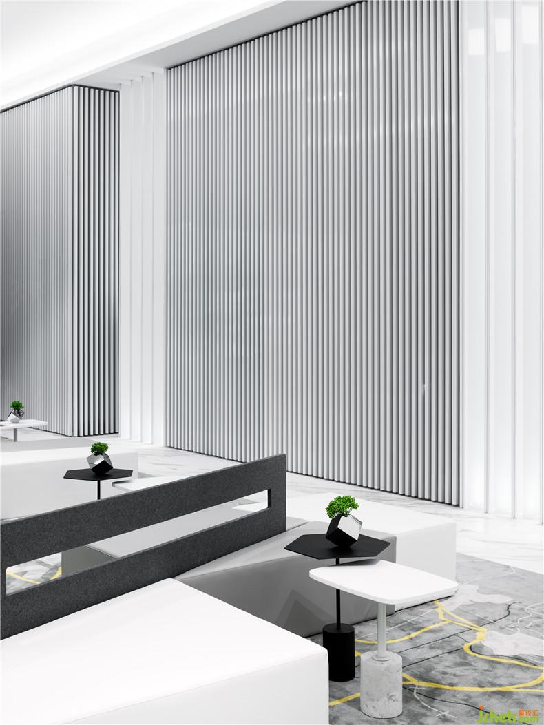 前廳入口處采用透光金屬板作為背景墻,平靜且富有層次的光感將訪客迎入充滿科技色彩的視覺空間。等候區(qū)擺放簡約的幾何形桌椅,凝練極簡的線條卻呈現(xiàn)抽象、張力的美感。