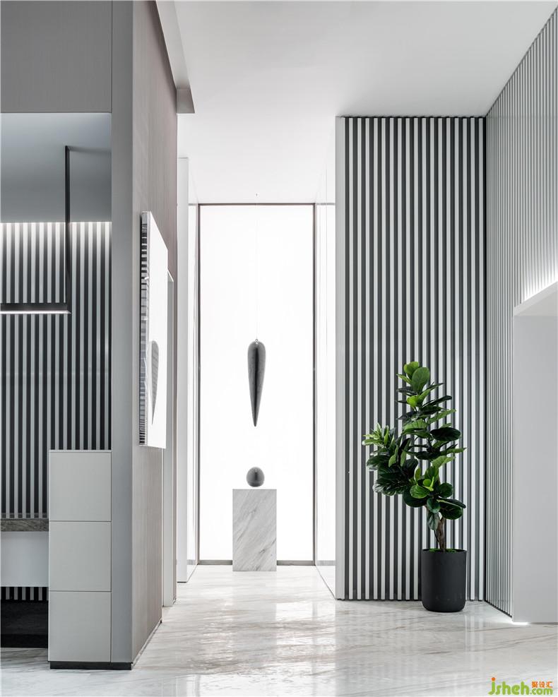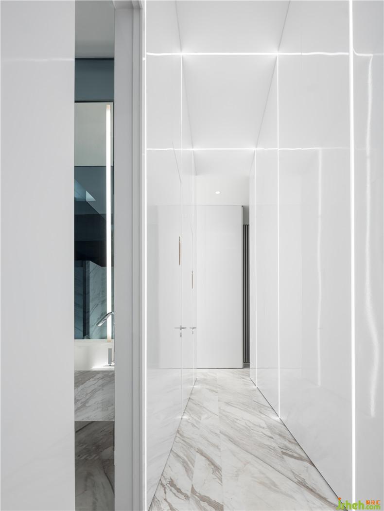 走道采用白色反光材質,蔓布其上的縱橫光帶交錯成一個虛幻的多維時空,行走其間,仿佛誤入空間隧道,等待著某個節(jié)點,過去與未來相連。