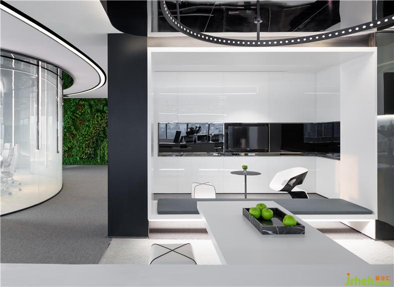 形似飛行器構件的主燈光源,給米其林水吧區(qū)增添了不少趣味,設計師的獨到構思推翻了傳統(tǒng)觀念中“科技感即冰冷”的認知。吧臺內部暗藏玄機,轉板翻出便是一個簡易討論桌,可滿足臨時會議的需求,讓辦公更具即時性和多樣性。