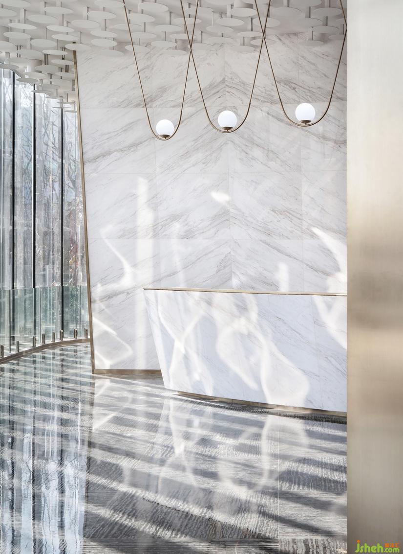 “內建筑”將空間整合打破空間的原有面貌,重塑空間的組合構成:將一直三層中心貫通,更為高聳的空間極具風范氣勢。室內設計師