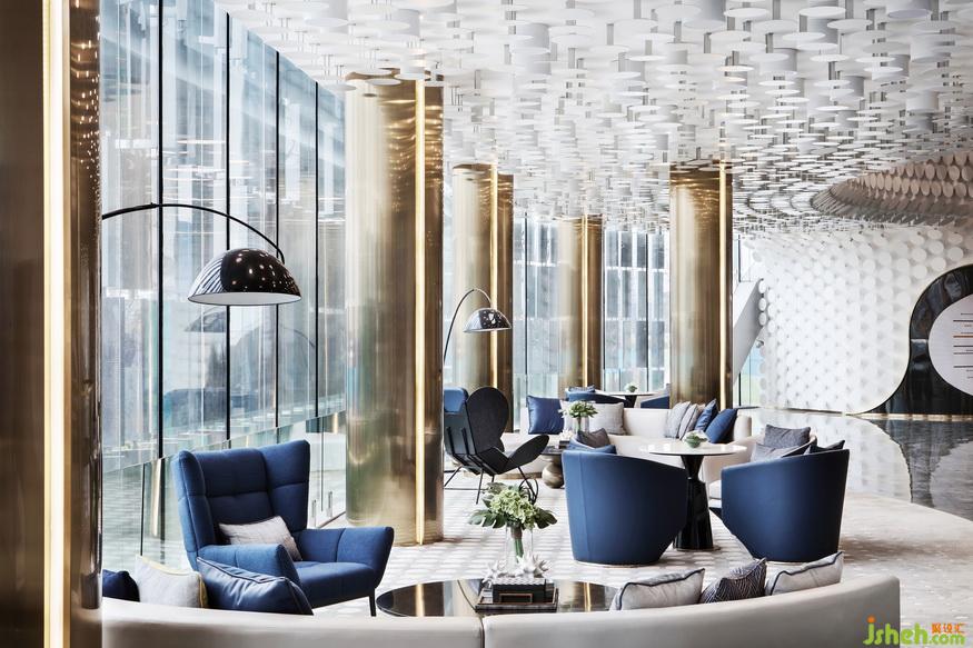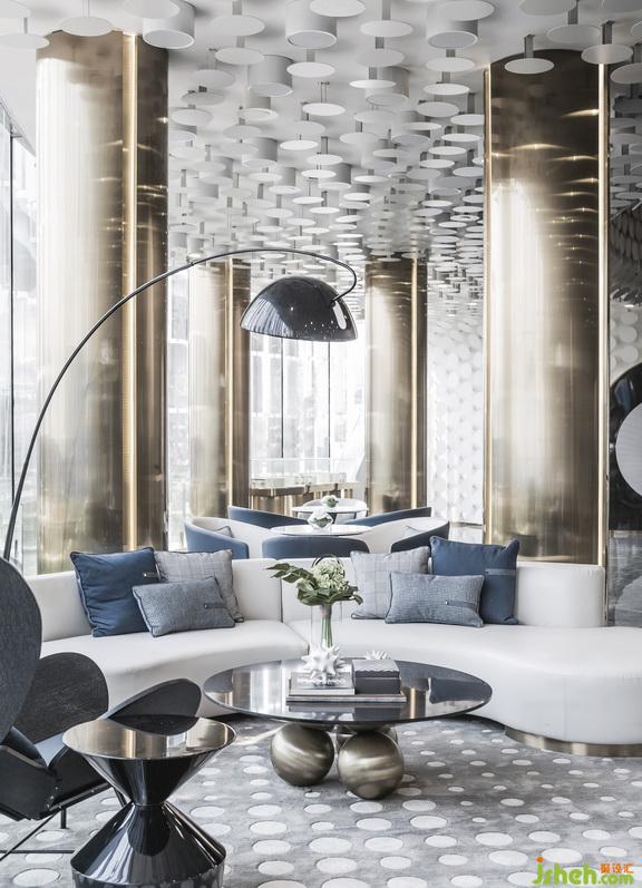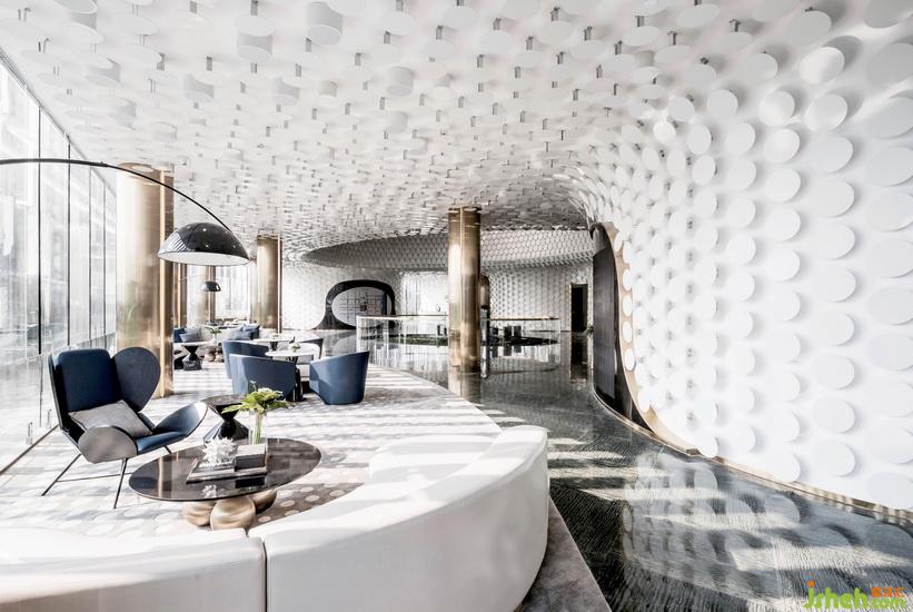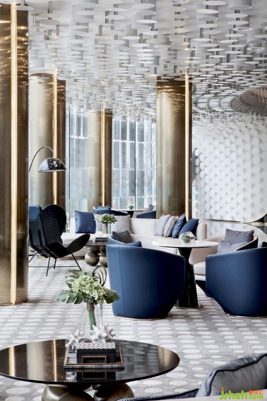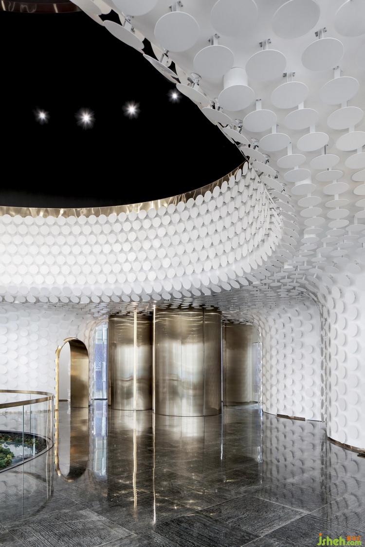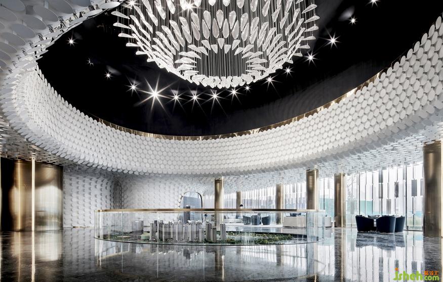 室內(nèi)設(shè)計師于空間中心,以懸掛燈具配合編程設(shè)計,成為了獨具匠心的互動裝置藝術(shù)。不止帶來光的閃耀,燈之本體亦動靜皆宜:靜止時優(yōu)雅不凡,變幻時流光溢彩。燈具之上層層疊退,以深色之頂意表稠墨的夜空,星空璀璨,華美之間,其盛大的視覺效果,吸引了所有人的目光。