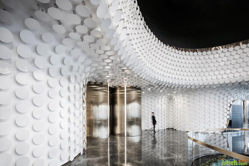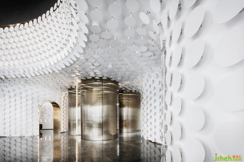 千余個純白定制的“圓”配以可調(diào)節(jié)角度的專屬構(gòu)件,伴隨著空間的流動有序的懸浮著,或匯聚或舒展的,隨著視線的軌跡,或遠(yuǎn)見幻化一體如夢幻境,或近觀組合韻律見光弄影;白圓匯聚能量,以參數(shù)化的構(gòu)成形成,由點成面,詮釋著新城發(fā)展的每一份期許,每一個日夜。
