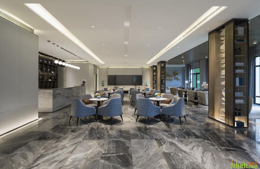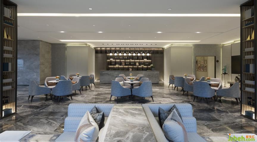 室內(nèi)設(shè)計(jì)師以大面積鋪陳的灰色花紋大理石營(yíng)造優(yōu)雅簡(jiǎn)約的質(zhì)感,定下整個(gè)空間的基調(diào)。前臺(tái)上方安裝雙色大型裝置吊飾,仿照水滴形態(tài),避免空間過于單調(diào)空洞。水滴寓意靈動(dòng)婉約,與寧波地處南方海濱這一信息相呼應(yīng)。室內(nèi)墻面運(yùn)用相同材質(zhì),搭配灰調(diào)軟裝擺設(shè),使空間充滿連貫性,在墻體中設(shè)置嵌入式書架、墻體上方挑高區(qū)采用豎形隔柵以豐富視覺體驗(yàn)。透明亞克力拼貼裝飾折射頂部光線,吸引視線焦點(diǎn)。