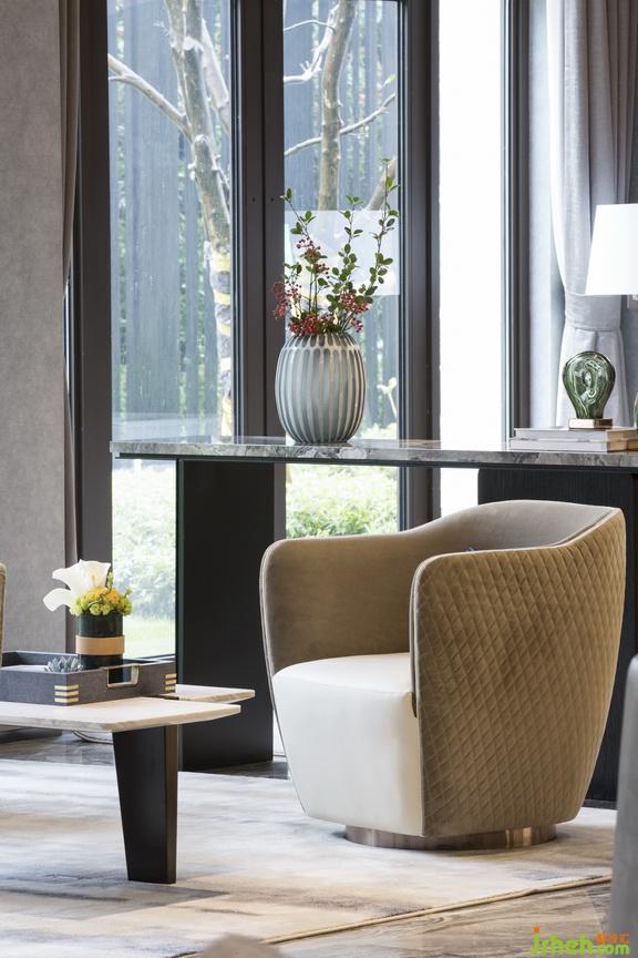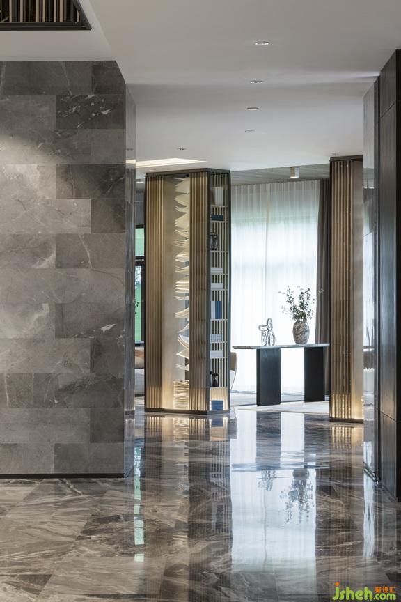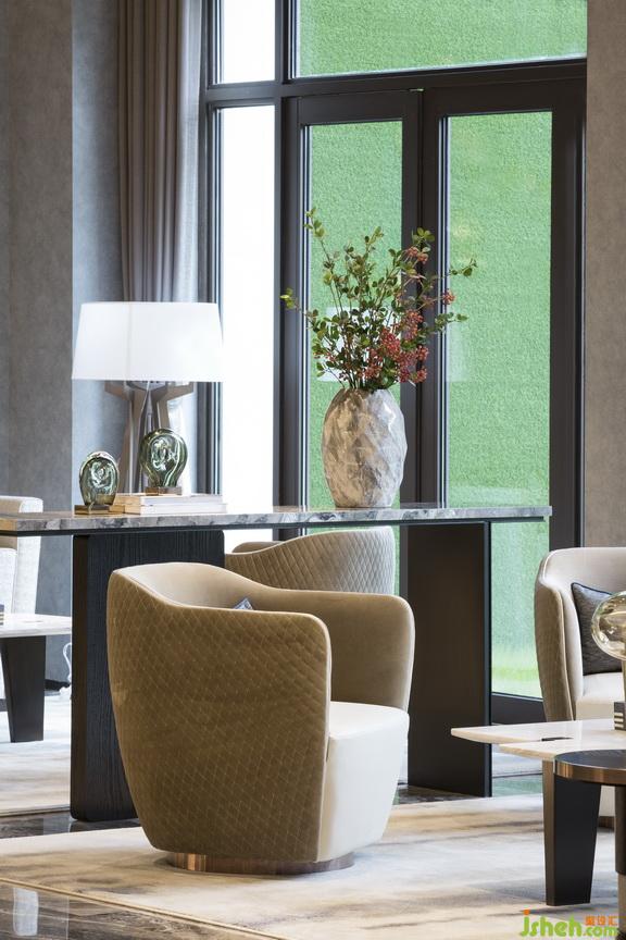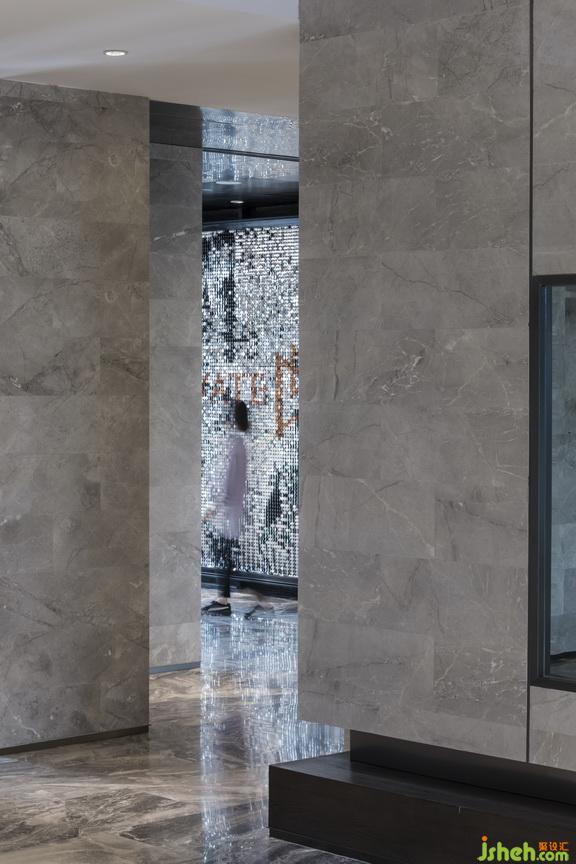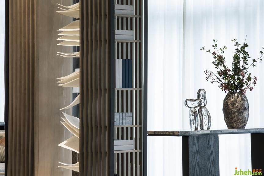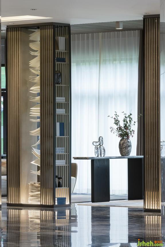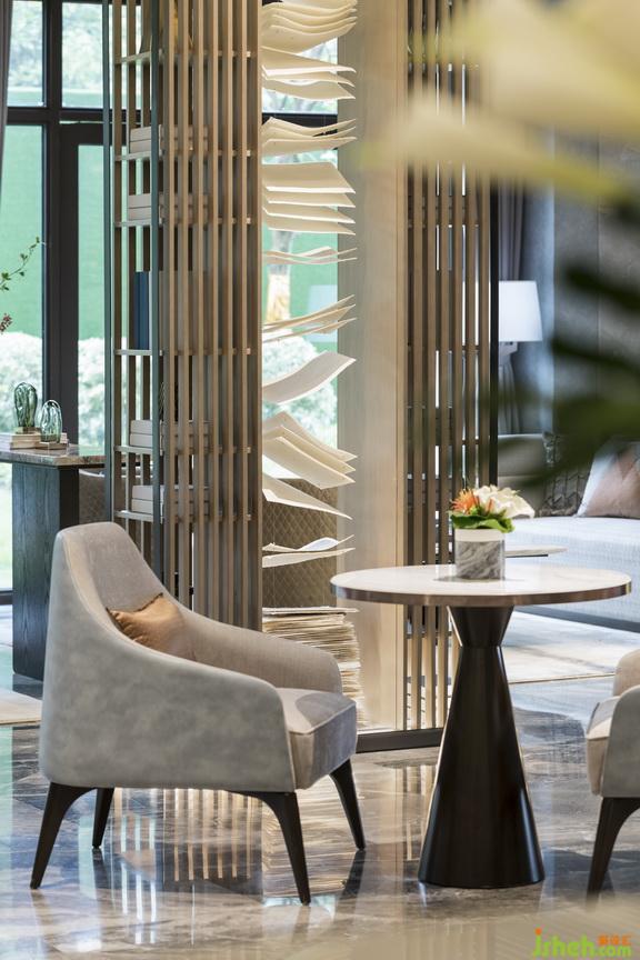 沿建筑內(nèi)部的外圍設(shè)置大面積落地窗,將室外的自然景觀與室內(nèi)空間相融合,形成內(nèi)外共通的局面,從視覺角度放大空間。落地窗周圍采用隔柵打造天花,通過材質(zhì)的不同劃定功能分區(qū)。黑色旋轉(zhuǎn)樓梯采用拼裝概念,提升空間的現(xiàn)代感,同時置入小型水滴形裝置吊飾,形態(tài)、材質(zhì)及大小的對比使空間達到視覺美感的平衡狀態(tài)。休憩區(qū)將裝置藝術(shù)、書架和隔斷三種功能結(jié)合,達到實用性與藝術(shù)性的共融。仿照書頁的藝術(shù)裝置以材質(zhì)的輕盈感模擬漂浮意境,提升空間的靈動性與透氣性。室內(nèi)設(shè)計師