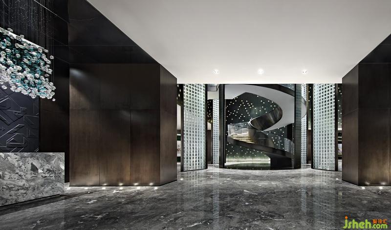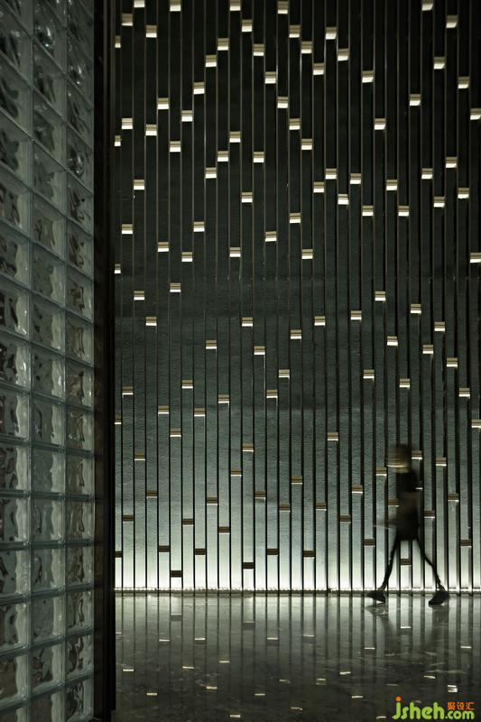 室內(nèi)設(shè)計師在前廳兩側(cè)接待處以立體幾何浮雕墻面渲染神秘,峻深勁利的線條勾勒出深沉內(nèi)斂的機械感,在精妙的布光下顯現(xiàn)出銳利的光痕。