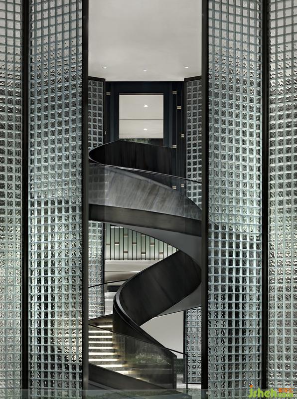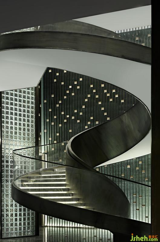 由玻璃磚塊堆砌而成的四道透明屏障將樓梯環(huán)繞包圍,受到能量加持的場域力匯聚并向四周揮灑散。若從上方向下探視,便能窺見一只俯沖而下的神鳥,在漫天螢光中颯然抖動纖長的尾翼。