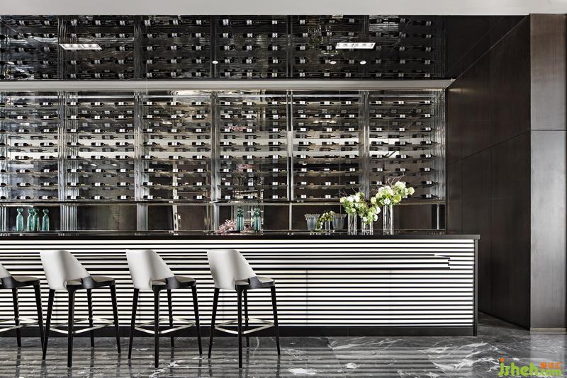水吧臺通過概括提煉的方式增強空間形式感,室內(nèi)設(shè)計師利用線性陣列與陳設(shè)元素的拼接傳達出肅靜、前衛(wèi)的時代氣質(zhì)。