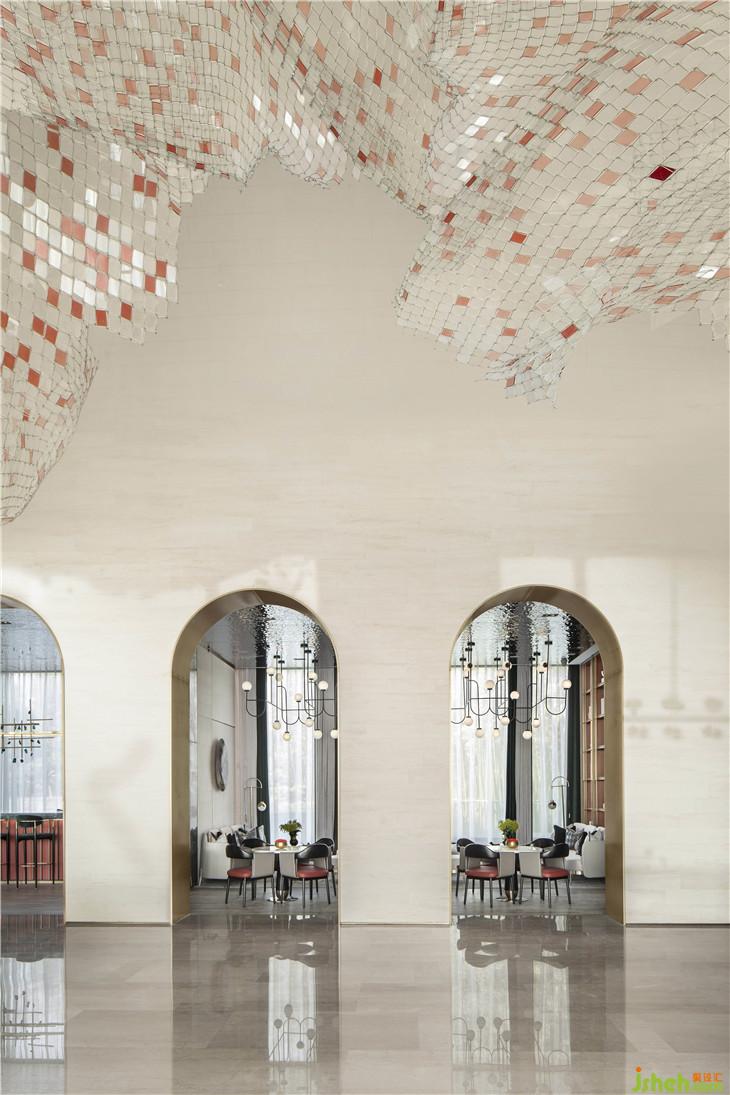 藝術(shù)長廊呈現(xiàn)了藝術(shù)的景深和時空的夢境,一扇扇拱門營造著端莊的序列感和層次感,節(jié)奏緩慢地帶人穿越藝術(shù)隧道,穿越宮殿紅的壁墻,回望煙波浩渺的歷史長卷。室內(nèi)設(shè)計師