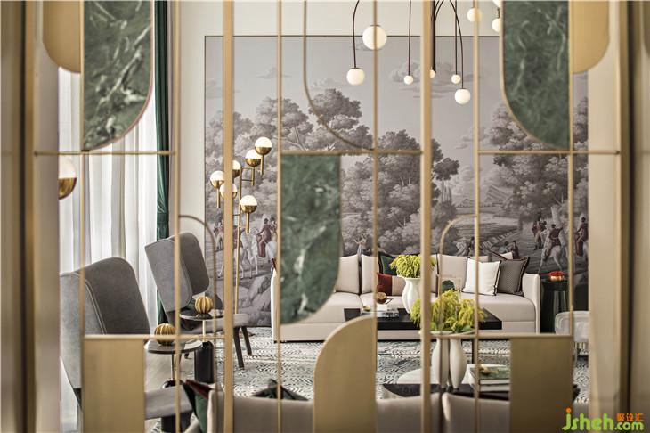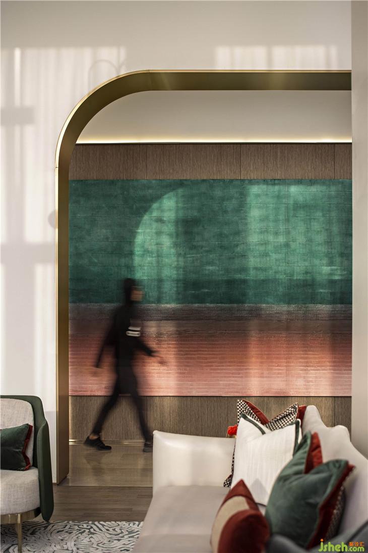 頂上的鏡面照應(yīng)出原始自然,清澈又模糊的鏡面如同閃動著粼粼波光的河流,濡染著鏡下的風景。宮殿紅與翡翠綠皆是至高無上王權(quán)的代表,二者歷來是經(jīng)典搭配。室內(nèi)設(shè)計師