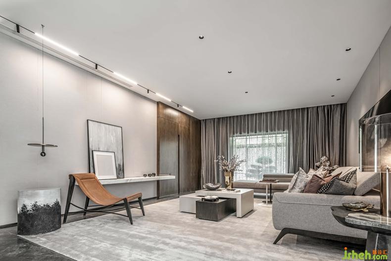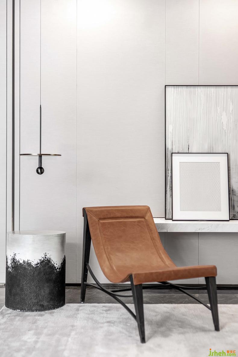 低飽和色調(diào)墻面點(diǎn)綴黃銅邊框呈現(xiàn)出高品質(zhì)生活氣息。兼顧實(shí)用性與舒適性的橙色皮質(zhì)躺椅搭配灰色絨毛地毯,舒適的觸感、清新的配色,塑造別樣的居住美感。別墅裝修設(shè)計(jì)