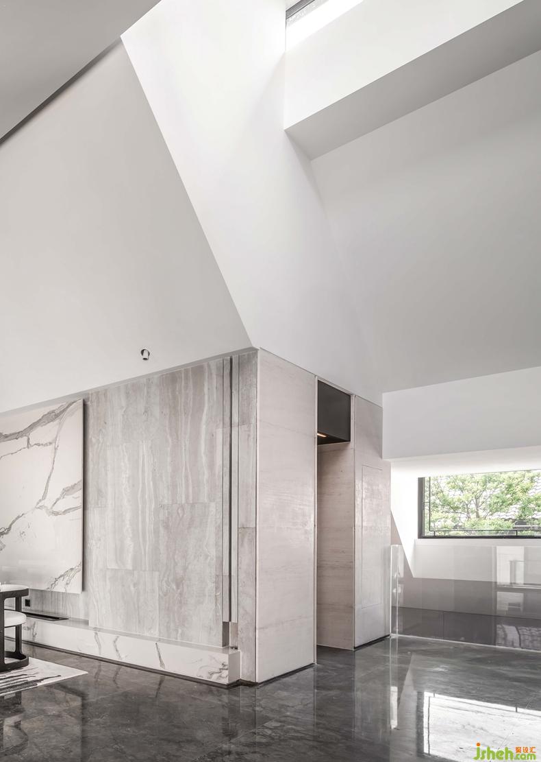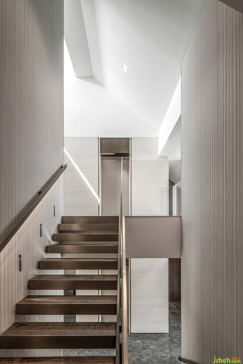 樓梯旁開(kāi)合性更強(qiáng)的空間,連通室內(nèi)與室外,引入了更多的自然光。空間縱橫貫通,視野通透而開(kāi)闊。