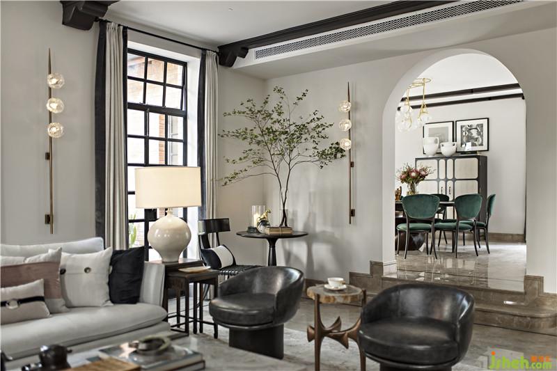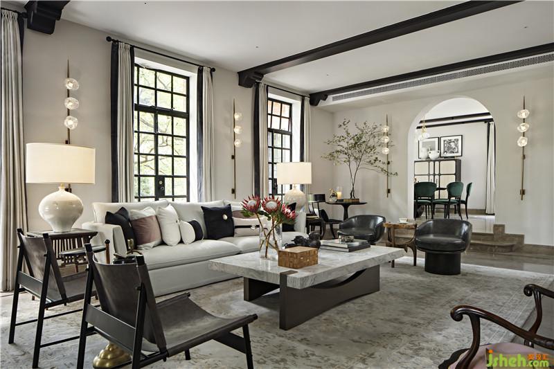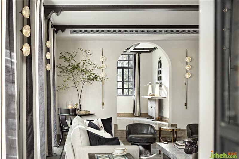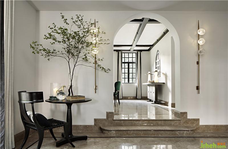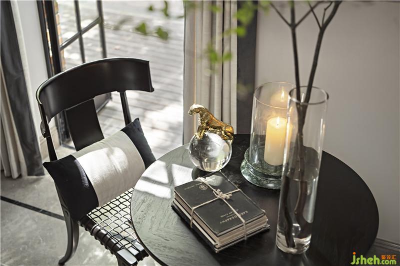 起居室背景展示墻,以混搭風格鋪陳出洛普普的敘事展現(xiàn)。原始的羚羊頭飾,彷若征服野性蠻荒,象征勝利光輝。鑰匙是正在延續(xù)著的權勢標志。設計師用跳色的編織盤與抽象藝術畫將微量的彩色疊加進黑白灰的間隙中,呈現(xiàn)出別樣、細膩的風情。而左下角的守護貓,一如埃及傳說中神秘的幸運守護者,正看顧著明亮通透的窗外,不斷朝曦夕映的美好時光。別墅裝飾