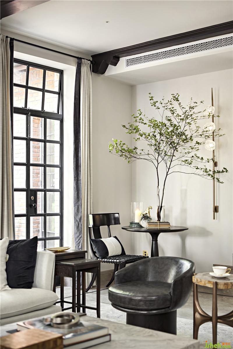 素凈的米白色為空間的主基調,復古橫梁與老上海窗格將空間輕柔切割,連帶著映入室內的光也多了幾分雅致。瓶中綠意與動物水晶球擺件為空間注入靈韻,用自然與優(yōu)雅勾勒出一個原始美麗的自然空間。