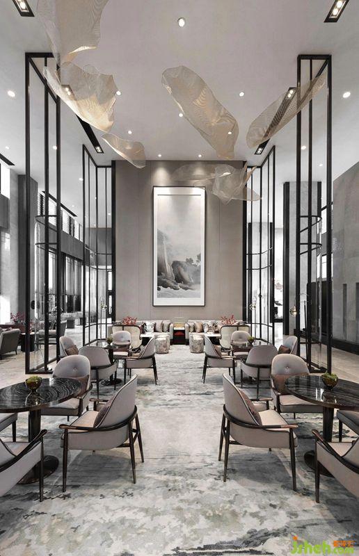 一墻之隔,屏風(fēng)采用疏密相間的縱向陣列結(jié)構(gòu),最大限度拉伸穹宇高度,空間因此澄澈洞明。夾絲玻璃材質(zhì)的屏風(fēng)將水吧區(qū)與洽談區(qū)巧妙隔開,虛虛掩映交談的私密性,這種猶抱琵琶半遮面的姿態(tài),脫胎于山水之地靈秀婉約的風(fēng)情。