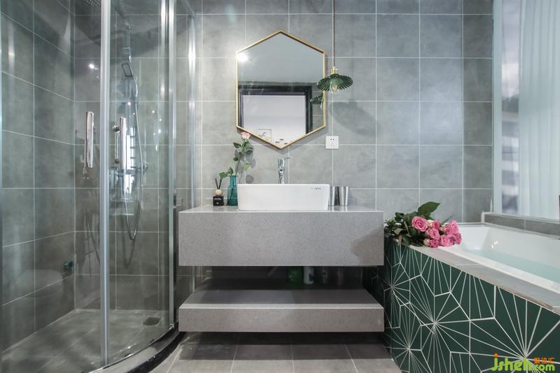 業(yè)主非常喜歡浴缸,室內(nèi)設(shè)計(jì)師在設(shè)計(jì)之初衛(wèi)生間這個(gè)面積是無(wú)法滿(mǎn)足浴缸和淋浴房同時(shí)存在的,所以我們將靠近客廳的墻打掉向外擴(kuò)大,同時(shí)也滿(mǎn)足客廳活動(dòng)空間。六角幾何磚為點(diǎn)綴色,墻地面全部滿(mǎn)鋪水泥灰磚,讓空間盡可能干凈。由于原來(lái)狹小的衛(wèi)生間沒(méi)有窗戶(hù),所以我們把靠近客廳那側(cè)墻改為玻璃,通透的玻璃窗是為了空間采光更好。懸空洗手臺(tái)的設(shè)計(jì)主要目的是在能儲(chǔ)物的同時(shí)讓空間看起來(lái)更加有層次感。