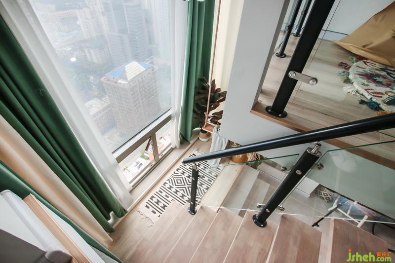 陽(yáng)臺(tái)也是一樓通向二樓的區(qū)域,所以室內(nèi)設(shè)計(jì)師在這個(gè)空間簡(jiǎn)單放置了一個(gè)小搖籃主要是給家里的一只小貓準(zhǔn)備的。臥室在二樓,如果業(yè)主想第一時(shí)間拉開(kāi)窗簾和話(huà)還需要下樓,所以采用電動(dòng)窗簾,也是科技和生活的融合。黑色鐵藝扶手加灰色踏步樓梯采用和風(fēng)格統(tǒng)一的顏色,同時(shí)黑色線(xiàn)條在層高較高的空間里比較有張力。