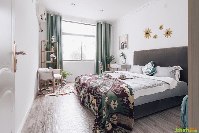 次臥兼具休閑工作區(qū)域,書桌墻上的油畫充滿童趣,波西米亞塔巾混搭出活潑的生活氛圍。