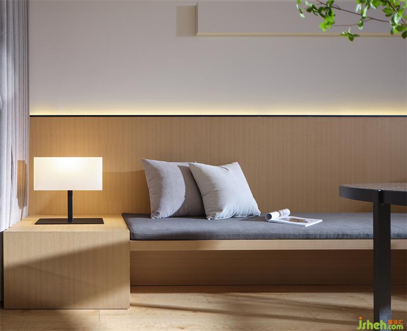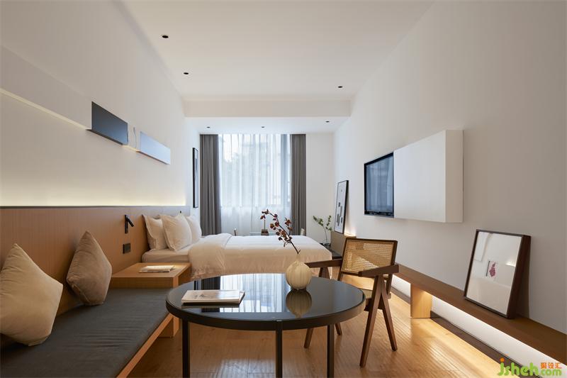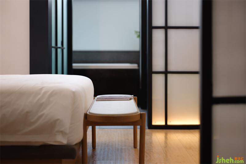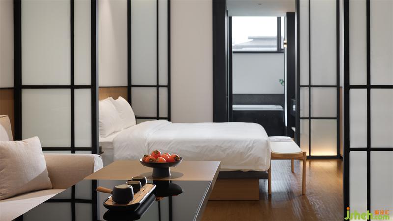 酒店設計于草堂間捕捉靈感,房間室內(nèi)兩側(cè)采用幾何造型玻璃屏風分隔功能區(qū),形成層層遞進的視覺效果,增加空間內(nèi)部的對比,在有限的空間內(nèi)讓人感受到空間意境。