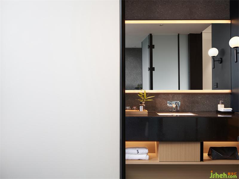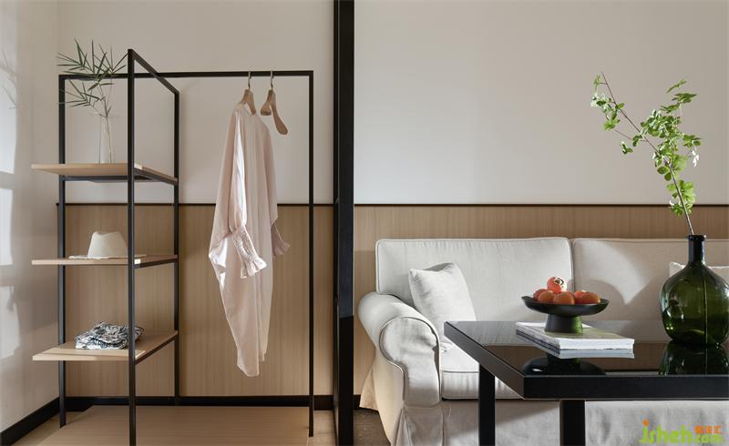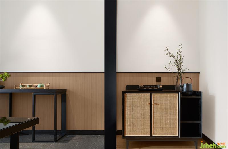 走道以利落的黑色線條對空間盡顯切割,運用對稱美學,既能穩(wěn)定空間結(jié)構(gòu),又給予空間空間寧靜感,引入氛圍。