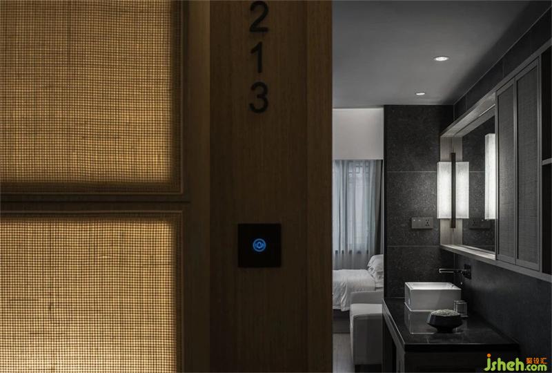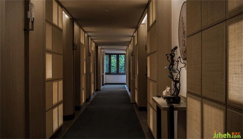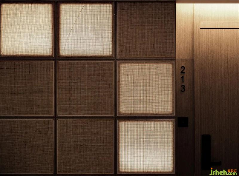 客房走道結(jié)合現(xiàn)有的建筑墻體形態(tài),通過凹凸形體的構(gòu)成關(guān)系,運用藤編和燈光的組合,營造除質(zhì)樸且細膩的通道氛圍。