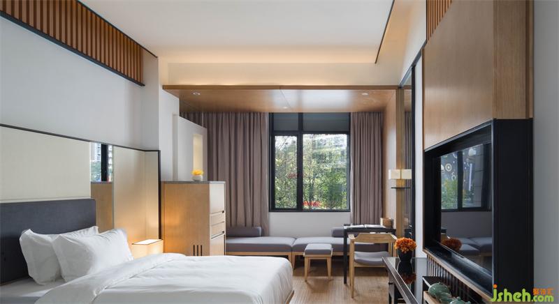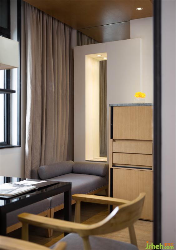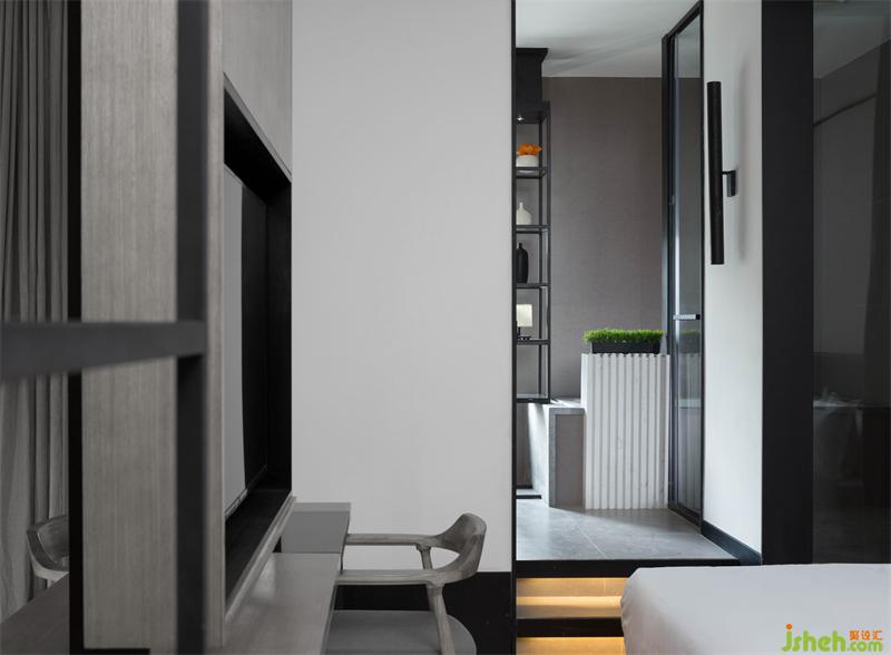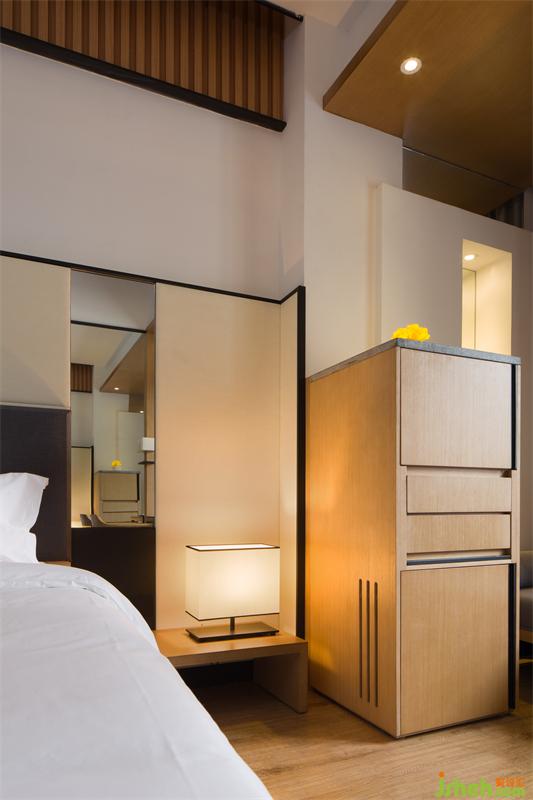 對于所有原本依附于墻體作為立面裝飾的功能元素如衣柜,迷你吧,電視墻等我們將其抽離開,獨(dú)立成個體后進(jìn)行平面布置,新建功能體,建筑原始結(jié)構(gòu),各個個體之間形成了大小各異的通道空間,打破了傳統(tǒng)酒店客房單一呆板的格局,增加了室內(nèi)的層次變化。