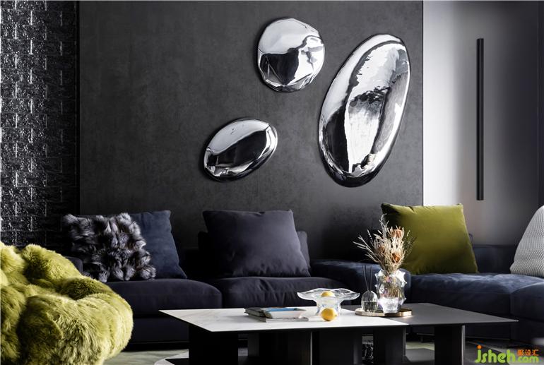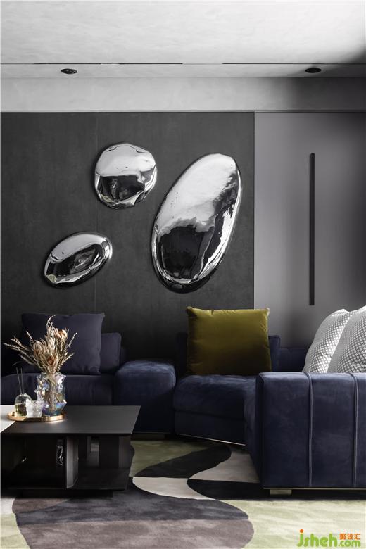 背景墻的銀色水滴裝置以其獨特的造型成為絕對的視覺焦點,為空間營造出個性十足的前衛(wèi)感。細(xì)膩觸感的沙發(fā)、毛絨質(zhì)感的座椅搭配異形地毯,透露出家的溫度。材質(zhì)的碰撞,形式的大膽讓空間獨特又有趣。