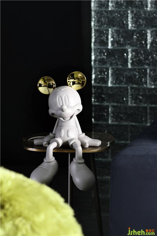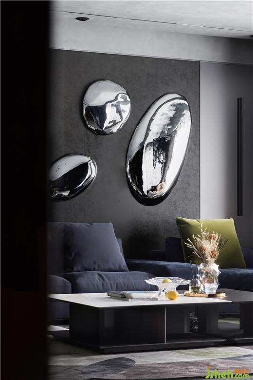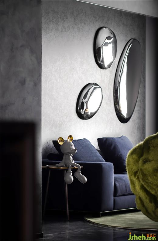 居住空間是屋主生活態(tài)度的展演。踏入玄關(guān),坐姿米奇營造出愜意舒適的歸家儀式,大平層裝修設(shè)計具有線條感的金屬置物架顯示出主人不凡的品味。在32㎡的恢弘客廳中,經(jīng)典藍(lán)的高雅、橄欖綠的輕奢、金屬銀的硬朗從灰黑色的沉靜背景中跳脫出來,豐盈了軟裝的層次感,多元而立體化地呈現(xiàn)空間個性。自由多樣化的家具隨心組合,迎合當(dāng)下時代年輕人的社交場景。