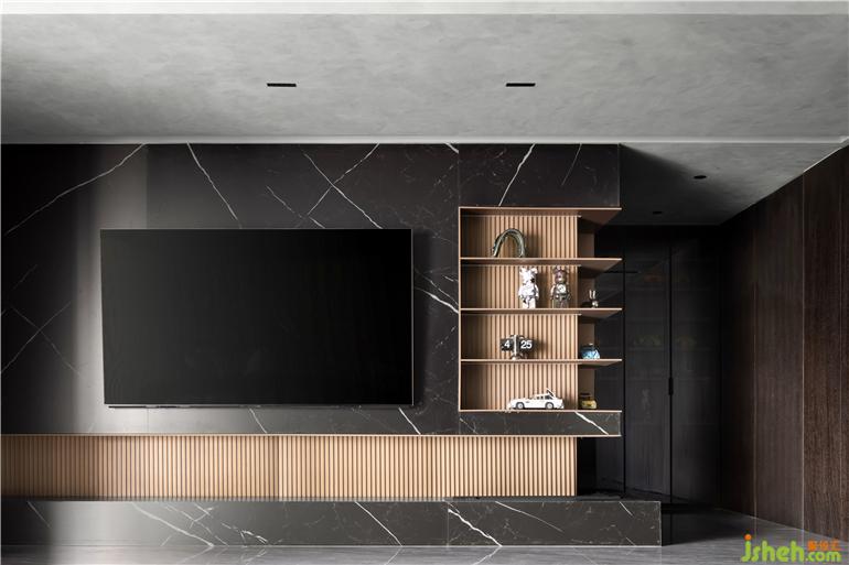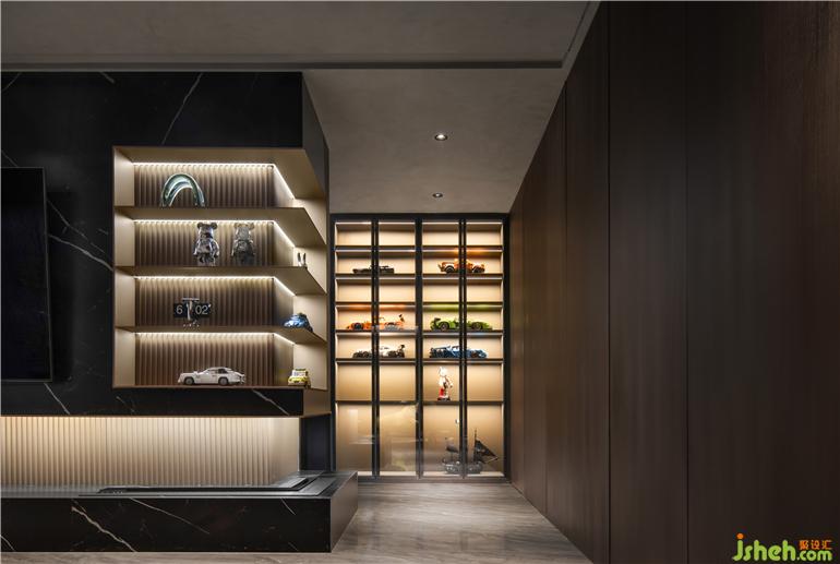 大平層裝修設(shè)計(jì)開闊的陽臺(tái)一隅為休閑區(qū),圓潤的弧線形沙發(fā)環(huán)抱式包裹,讓主人在此舒展身體,卸下疲憊。電視背景墻設(shè)置大空間收納的玻璃柜展臺(tái),藝術(shù)擺件、樂高潮物,是浸潤著屋主品味與想象的絕對臻藏,彰顯新貴階層的獨(dú)特個(gè)性和自我表達(dá)。
