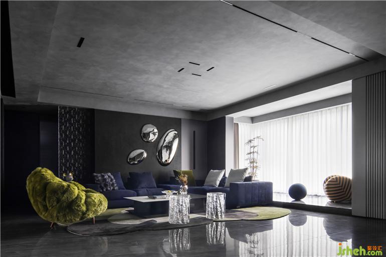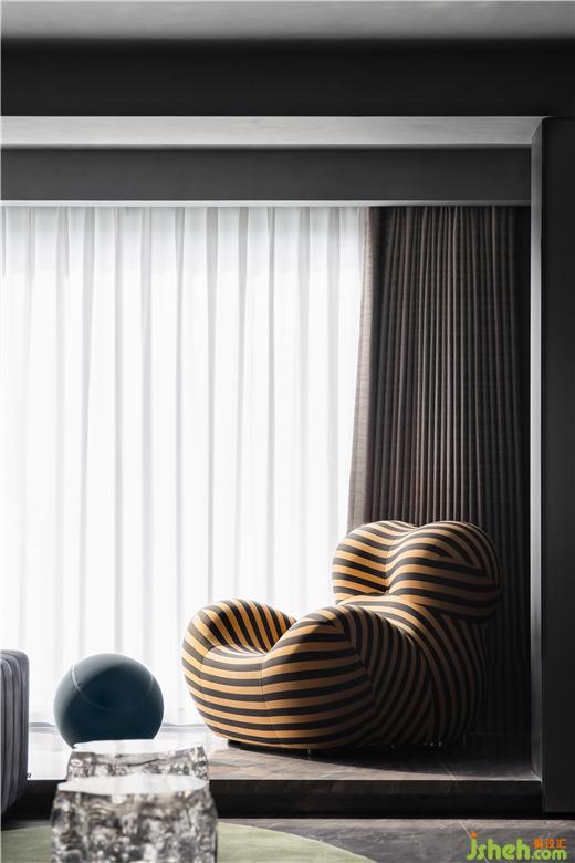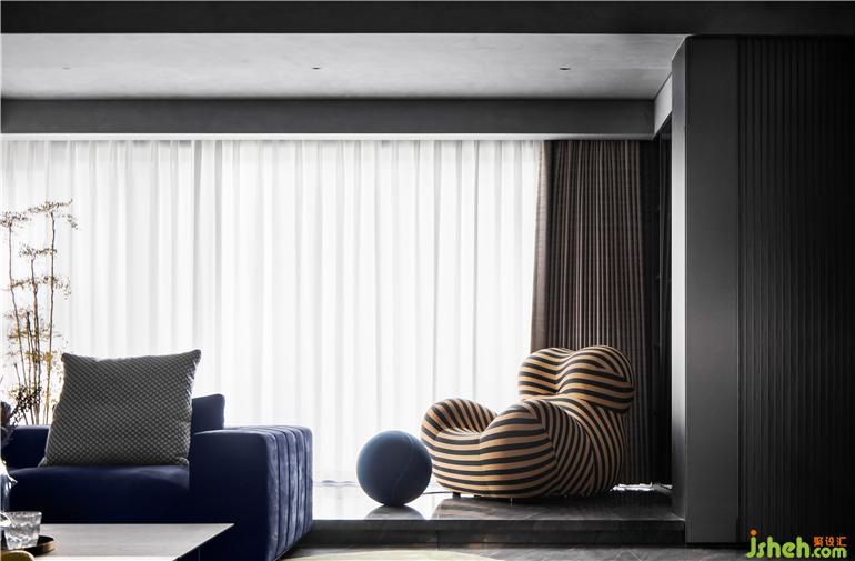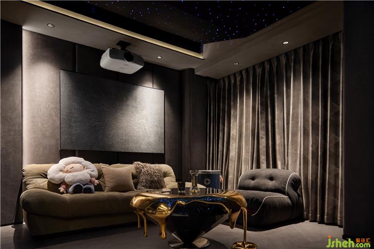 影音室采取整體遮光處理,雙人云朵沙發(fā)搭配個(gè)性牛仔面料的單人沙發(fā),適合獨(dú)自觀影、多人游戲、家庭K歌等多種社交場景,大平層裝修設(shè)計(jì)打造一個(gè)溫暖且具有隱私感的空間,為居住者帶來放松而沉浸式的體驗(yàn)。水滴型茶幾具有堅(jiān)硬的金屬質(zhì)感,猶如凝固的藝術(shù)品,表達(dá)一種玩酷、探索、有趣的理念。