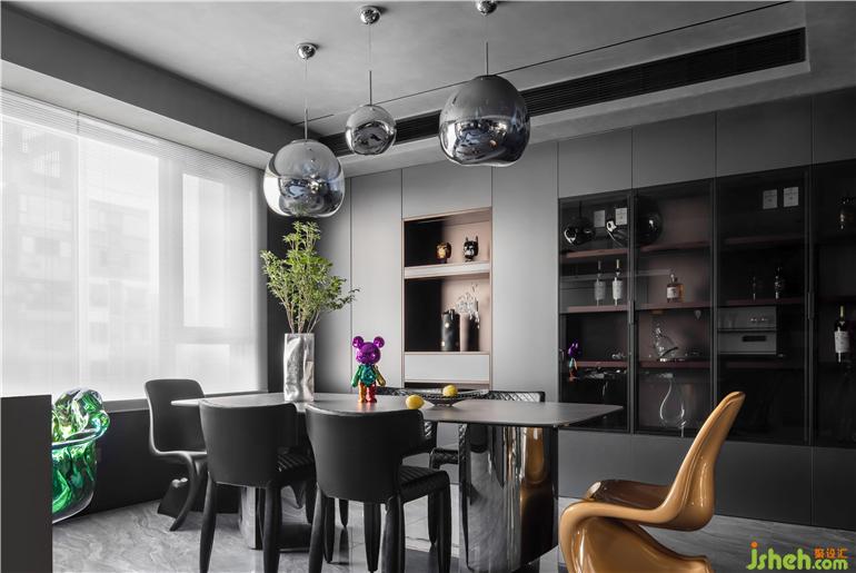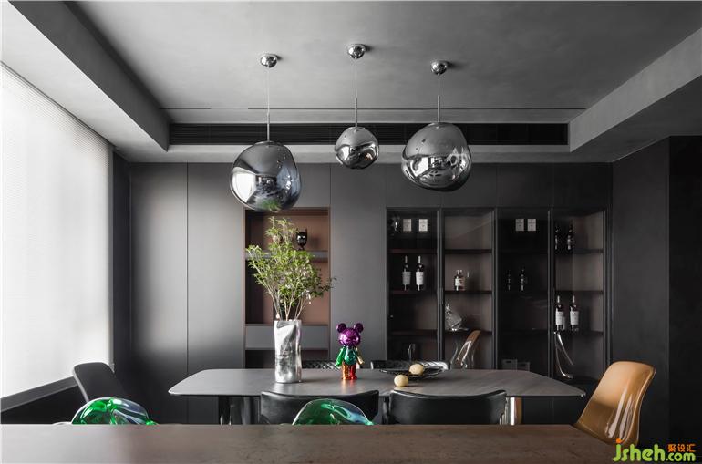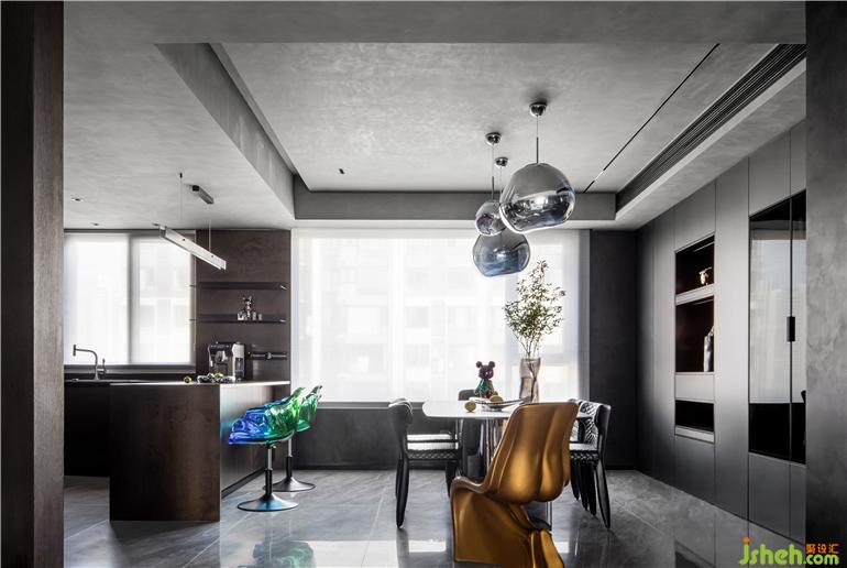天然的藍(lán)色熔巖吊燈,散發(fā)出迷人的光線,襯托出日常生活中的就餐儀式。Edra花瓣椅作為吧椅和餐椅兩用,大平層裝修設(shè)計(jì)散發(fā)出琥珀般的光澤,成為廚房的點(diǎn)睛之筆。簡約又藝術(shù)的Mahza吊燈,直線型的線條延續(xù)硬裝的設(shè)計(jì)語言呈現(xiàn)出和諧的節(jié)奏。