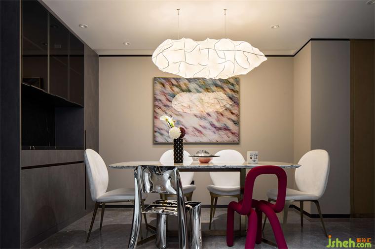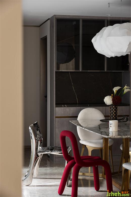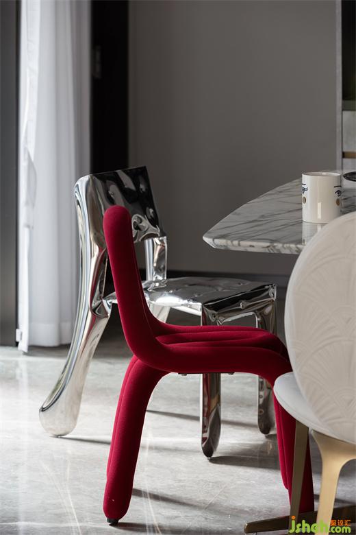 紅色和不銹鋼材質(zhì)的餐椅組合,中海望京府復(fù)式家裝設(shè)計(jì)營(yíng)造了集品質(zhì)、藝術(shù)、舒適為一體的輕奢生活方式。一餐一食,一酌一飲,一家人圍著餐桌享受美食,偶爾伴隨幾句嬉笑,繪就了一幅幸福美滿的和諧畫面。