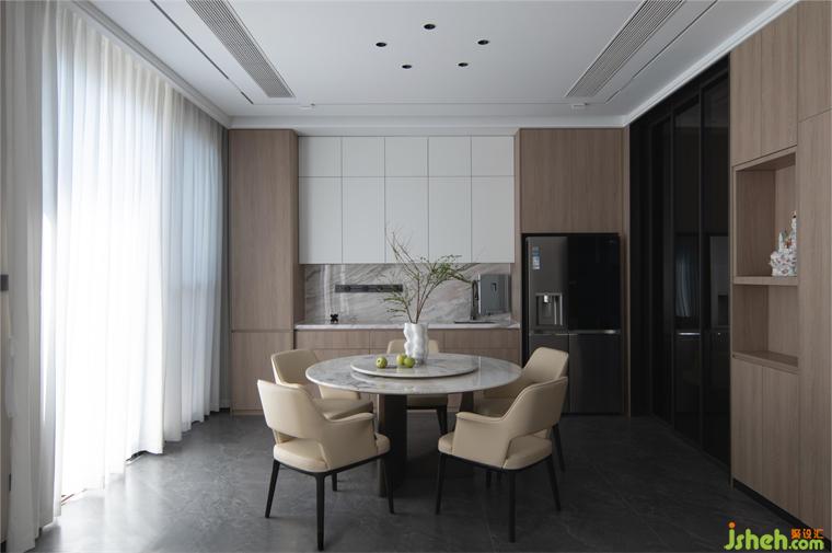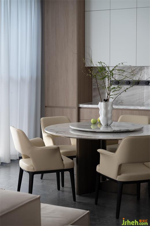 圓形的餐桌,米白色的餐椅,別墅裝修設(shè)計(jì)所有的設(shè)定均以生活動(dòng)線與習(xí)慣來模擬并加入豐富的創(chuàng)意量身訂做,在這里獨(dú)自品酌或與親朋對(duì)飲,情思爽然,便是人間樂事。