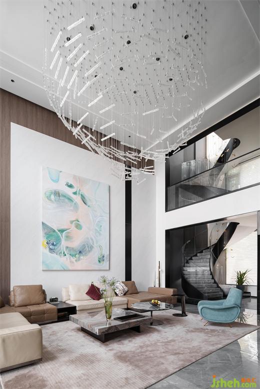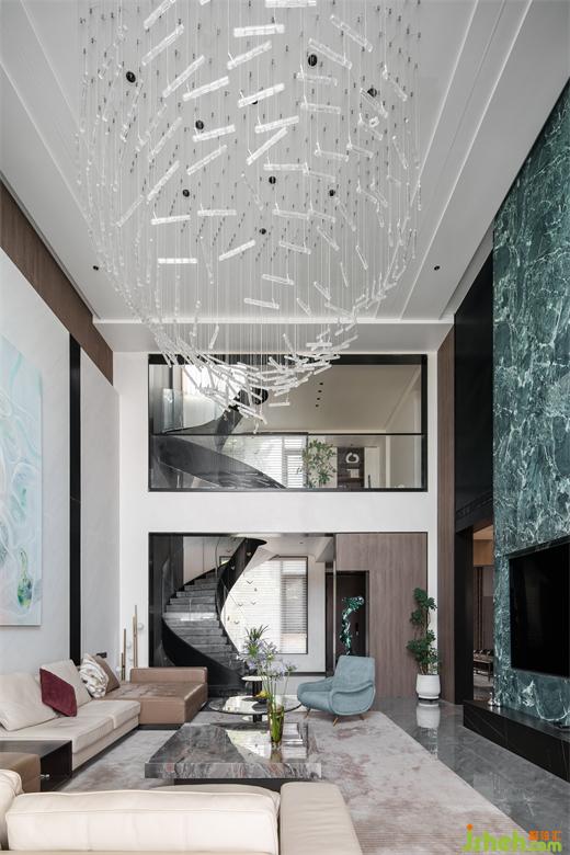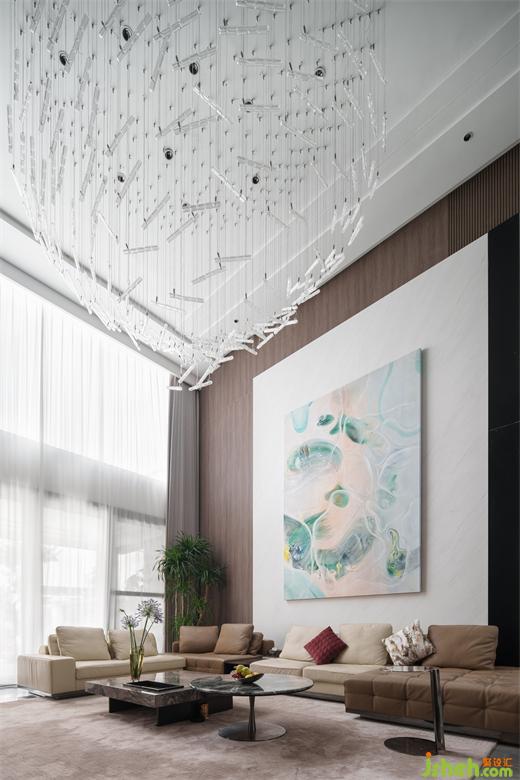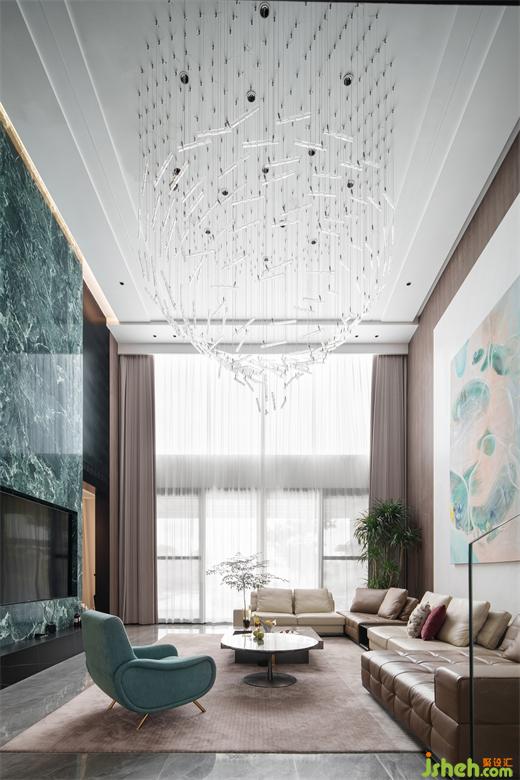 家庭廳的高挑空以豪宅客廳的空間氛圍加以打造,頂部不再是具象的燈,配以星星點(diǎn)點(diǎn)的水晶吊燈,如流云、如星空,玲瓏剔透,光影斑駁。