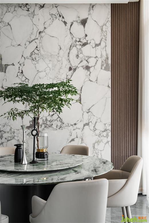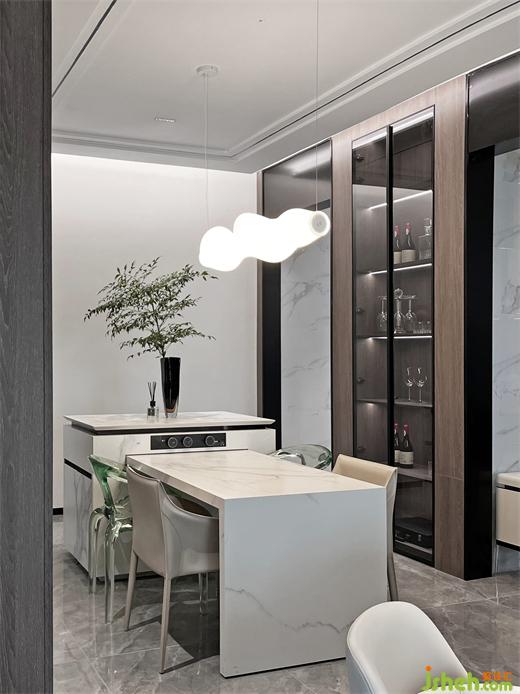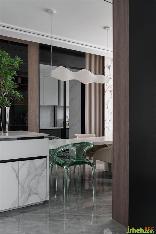重慶別墅設(shè)計(jì)一樓的餐廳以接待為核心功能實(shí)用,開(kāi)放式格局餐廳與客廳相互串聯(lián)而富有層次感,視覺(jué)通透讓整個(gè)空間寬敞,大氣;大花白大理石桌面線條優(yōu)雅,恰似被自然暈染過(guò)的簡(jiǎn)約流暢,家人就餐以及日常社交都可以在此進(jìn)行,廚房空間清爽明亮,推拉門(mén)設(shè)計(jì)使得開(kāi)放與封閉可自由切換,實(shí)用的同時(shí)打破廚房與外部交流的屏障。