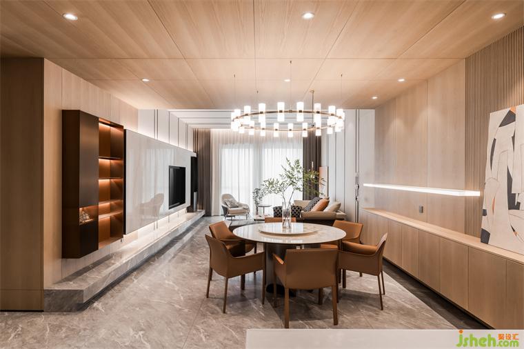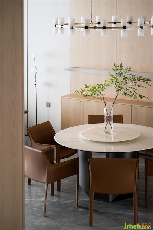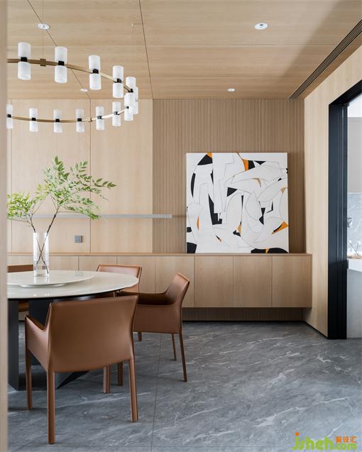 一層客餐廳空間開闊雅致,糅合著秩序節(jié)奏與空靈飄逸感,人隨境而轉(zhuǎn),舒適感極佳。富有層次感的色彩搭配度獨(dú)到的空間裁切、雅致的家裝鋪陳,都彰顯著匠心與考究。沒有過多莊重的設(shè)計(jì),獨(dú)特的裝飾畫、精美的吊燈和別致的植物,為餐廳增添了一份獨(dú)特的氛圍和個(gè)性化的魅力。在光影之下盛放靜謐如畫,演繹著一家人三餐四季的浪漫生活。