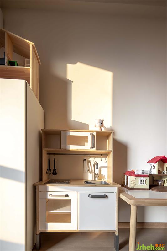 即使在客廳設(shè)有專門的玩樂區(qū),兒臥的趣味布置依然未減少,這里擺放著小朋友專用迷你家具,小小的柜子里放滿漂亮的裙子或是最愛的玩具,某個空間可能還藏著她舍不得分享給小伙伴的寶藏,而利用兒臥墻體外移形成的凹墻定制了超薄實木陳列架,上面則擺放著睡前最愛的繪本故事。明黃的窗簾,微粉的墻壁,夕陽時,窗外的陽光偷溜進來,整個房間像被點燃了一樣,盈滿暖暖的光,這里就是她的城堡,明媚,有趣,安心。