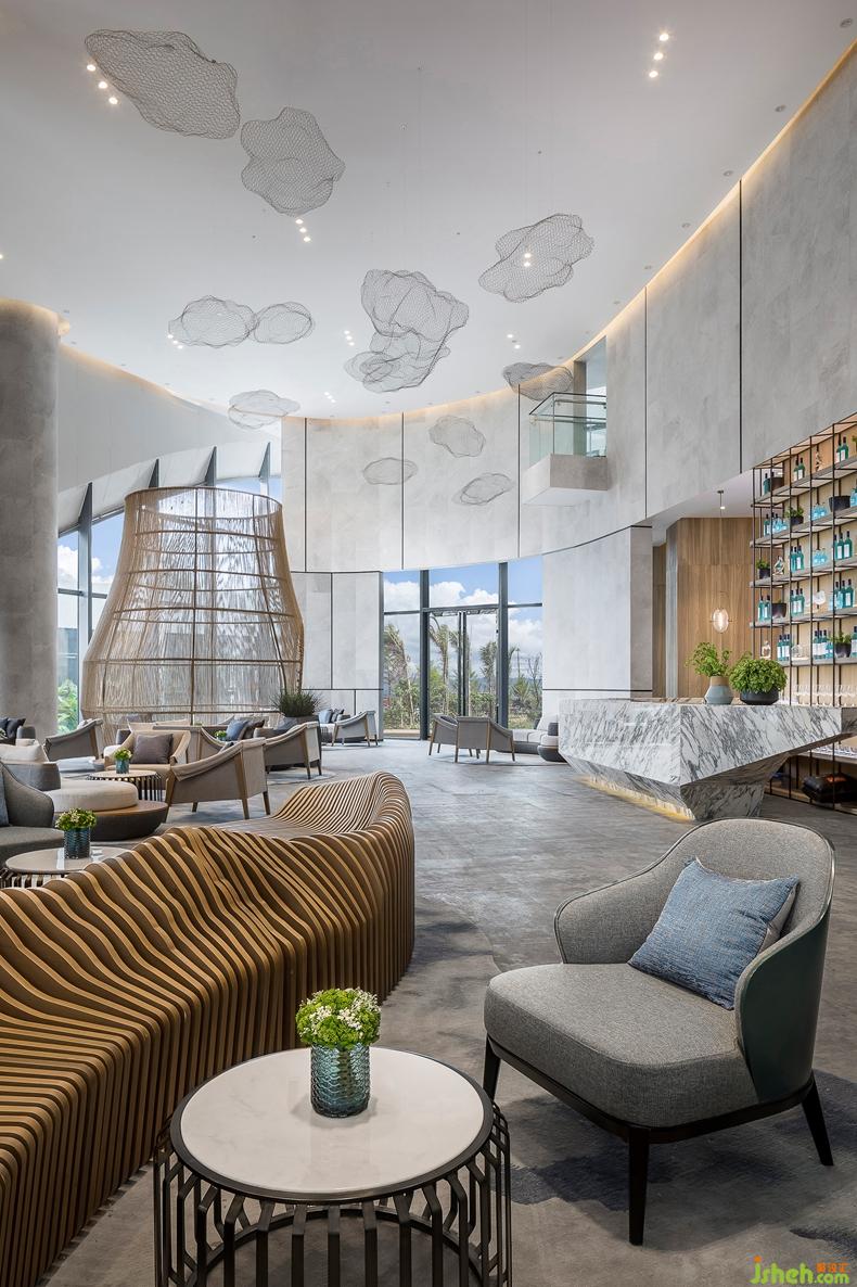 空間中大量運(yùn)用圓弧形的線條,靈動(dòng)而優(yōu)雅。設(shè)計(jì)公司延綿不絕的流動(dòng)線條恰如三亞柔美的海岸線,亦呼應(yīng)了建筑的外觀特色。