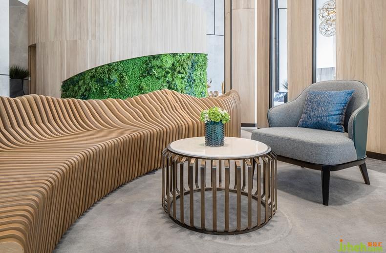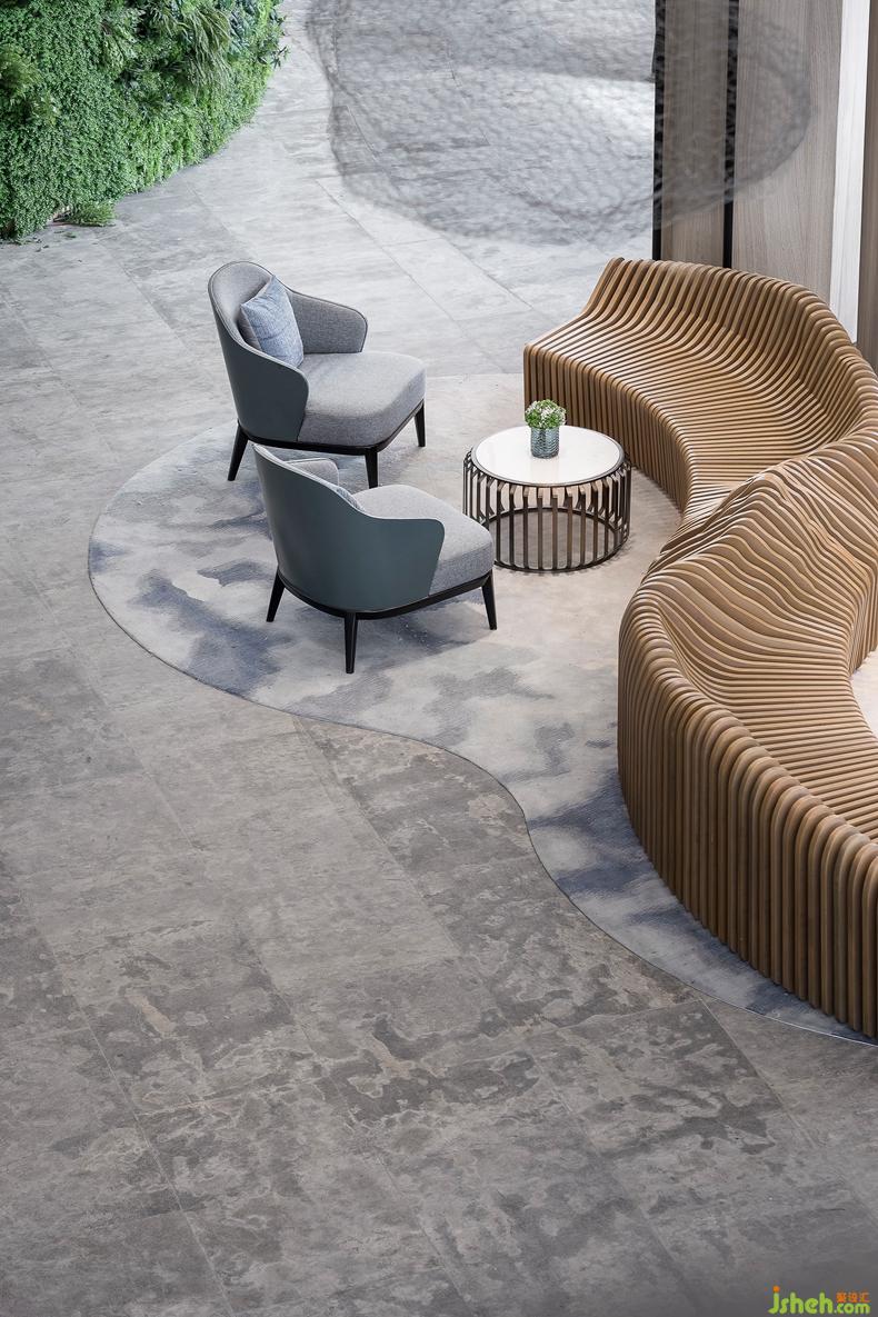 地毯延續(xù)灰色地面,視覺上空間得以延伸,恰好與座椅的質(zhì)感形成一致,設(shè)計(jì)公司連續(xù)性的木質(zhì)波浪座椅如涌動(dòng)的波浪,引人遐想之余也呼應(yīng)了整體的基調(diào)。
