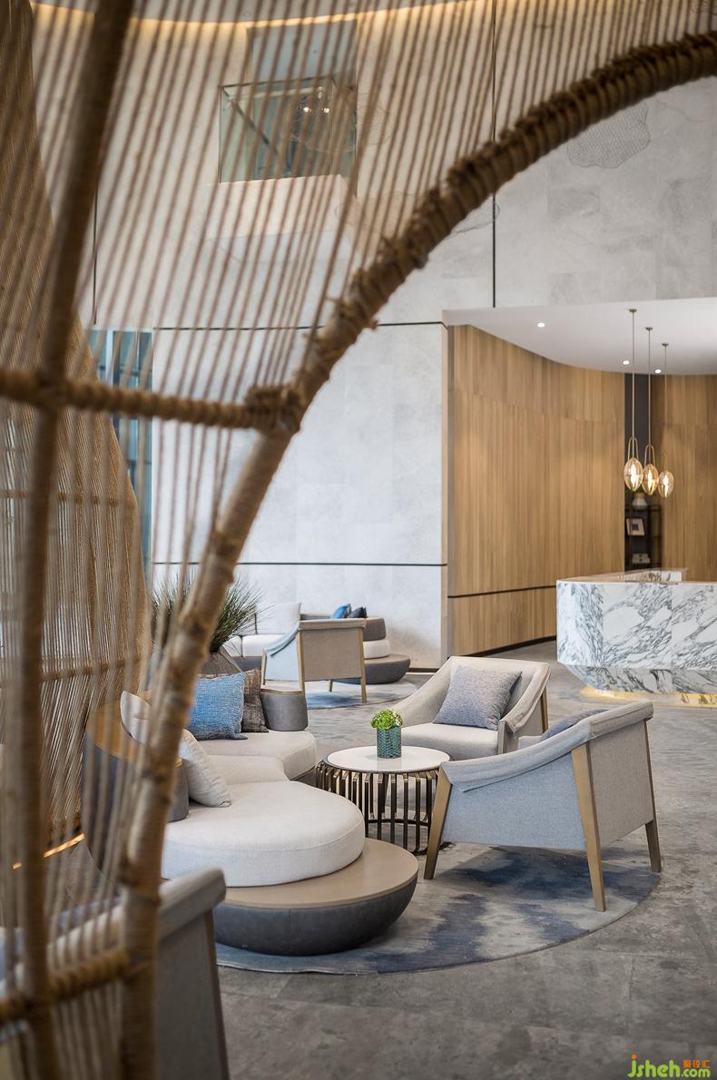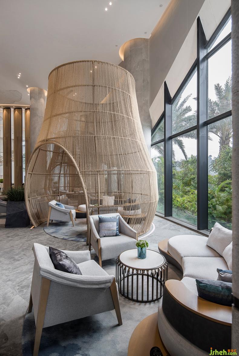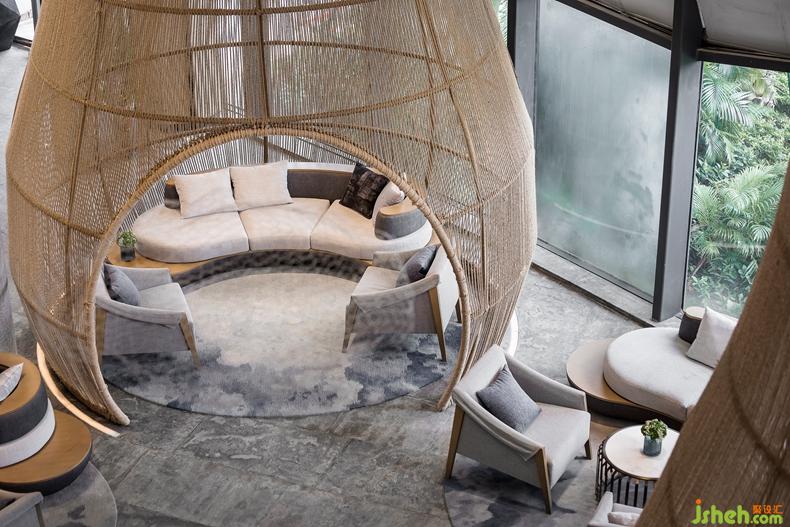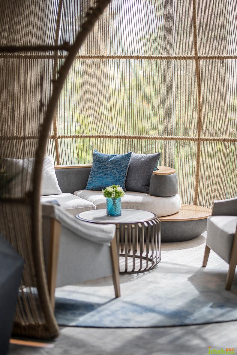 自由散落在洽談區(qū)的半開放圍合空間,靈感來源于海島黎族原居民的傳統(tǒng)藤編,其傳統(tǒng)住房,以樹干作支架,竹片編墻。如今,藤編已成為一項(xiàng)海南省級(jí)非物質(zhì)文化遺產(chǎn)保護(hù)項(xiàng)目。