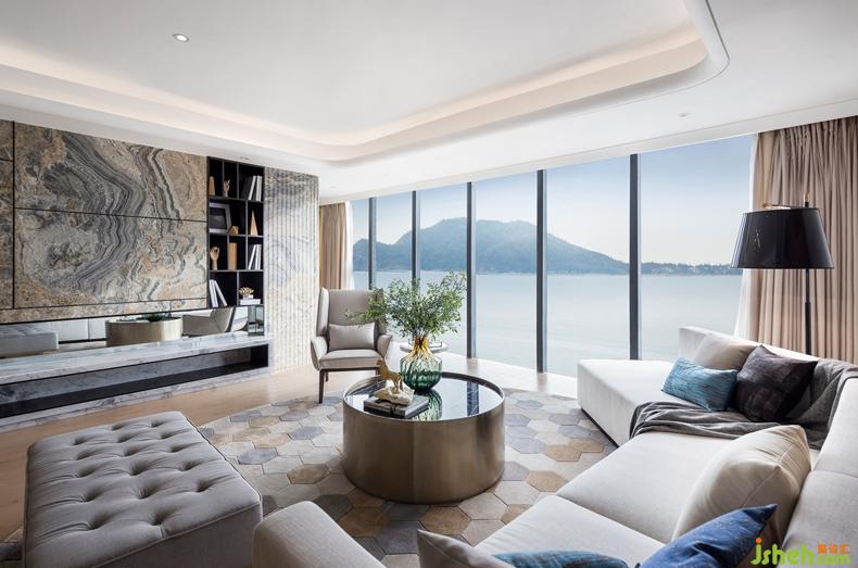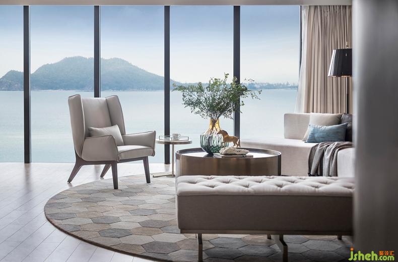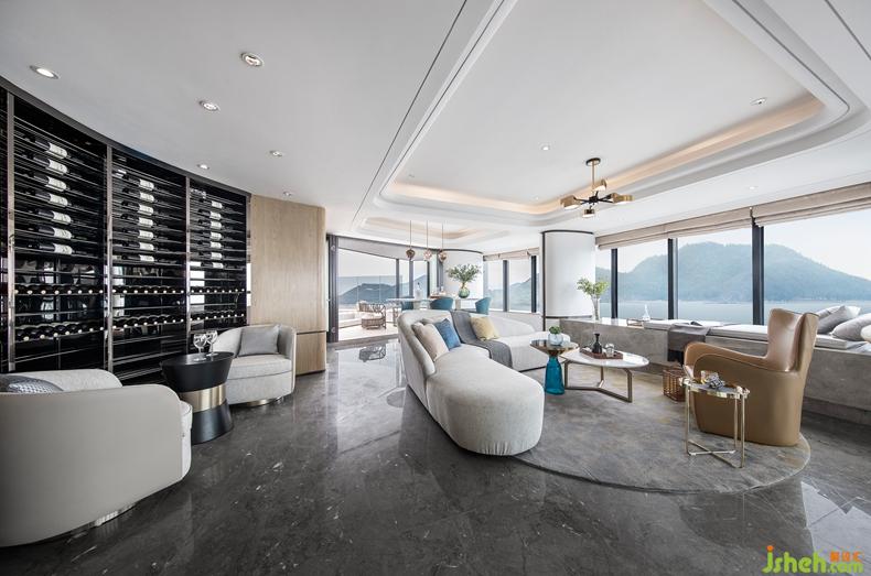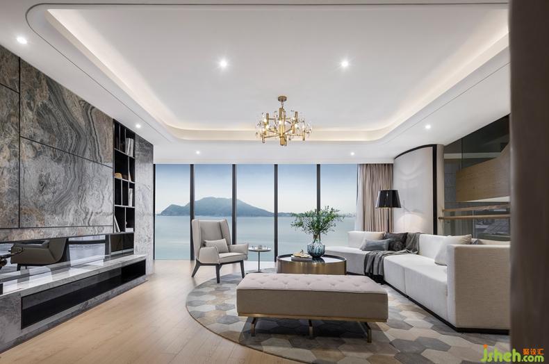大面積的通體落地窗,以最大尺度對灣區(qū)進行場景化定格,將絕美風光引入室內(nèi),縱目遠觀,獨屬于海邊的愜意感受得以鋪陳抒發(fā)。開敞式的生活起居區(qū)功能協(xié)調(diào)連貫,曲線優(yōu)美的背景墻作為停頓穿插其中,隔而不斷,避免空間的冗長感,與窗外連綿不絕的海景呼應(yīng)成趣。