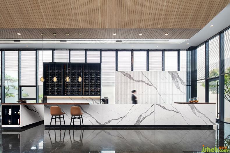 接待總臺與水吧區(qū)合二為一,不同材質(zhì)與紋理經(jīng)過別出心裁的組合,凸顯質(zhì)感與品味。