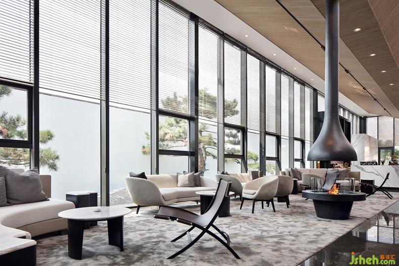 在建筑到室內(nèi)的空間構(gòu)想中,我們采取了北實南虛的處理手法,室內(nèi)設(shè)計師北面以實墻隔斷噪音,南面則引入景觀,忽略室內(nèi)外邊界,穿插內(nèi)外庭院,實現(xiàn)不斷變化的連接與互動。