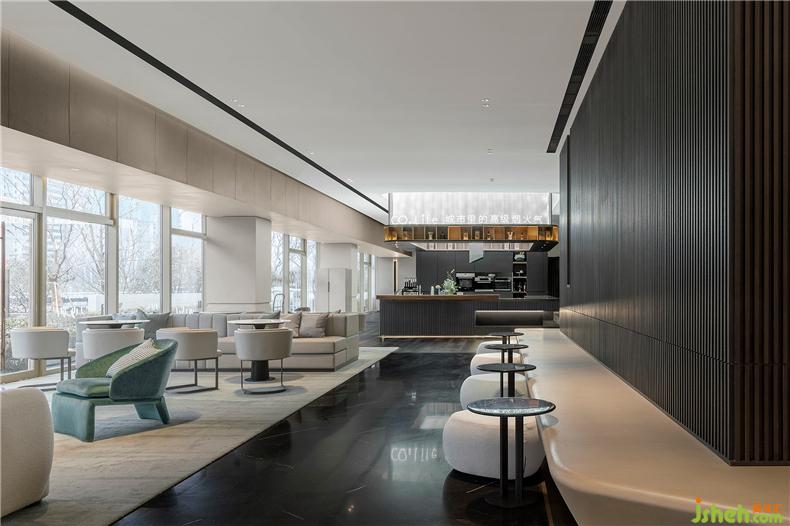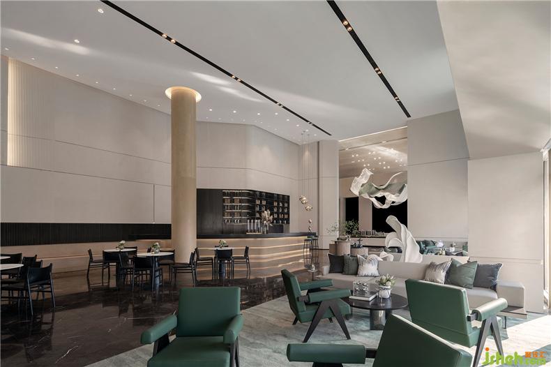 咖啡吧臺,深色與白色石材相拼,在燈光的暈染下,與深色的木飾面背景,室內(nèi)設(shè)計(jì)師融匯成一幅現(xiàn)代時(shí)尚、香氣濃郁的空間畫面,同時(shí)植入互動(dòng)打卡裝置,現(xiàn)場可親自體驗(yàn)手沖咖啡,滿足社交分享新流行。醇厚的咖啡香氣彌漫一室,別具一格的情調(diào)呼之欲出,咖啡文化的詩意切面展呈得淋漓盡致。